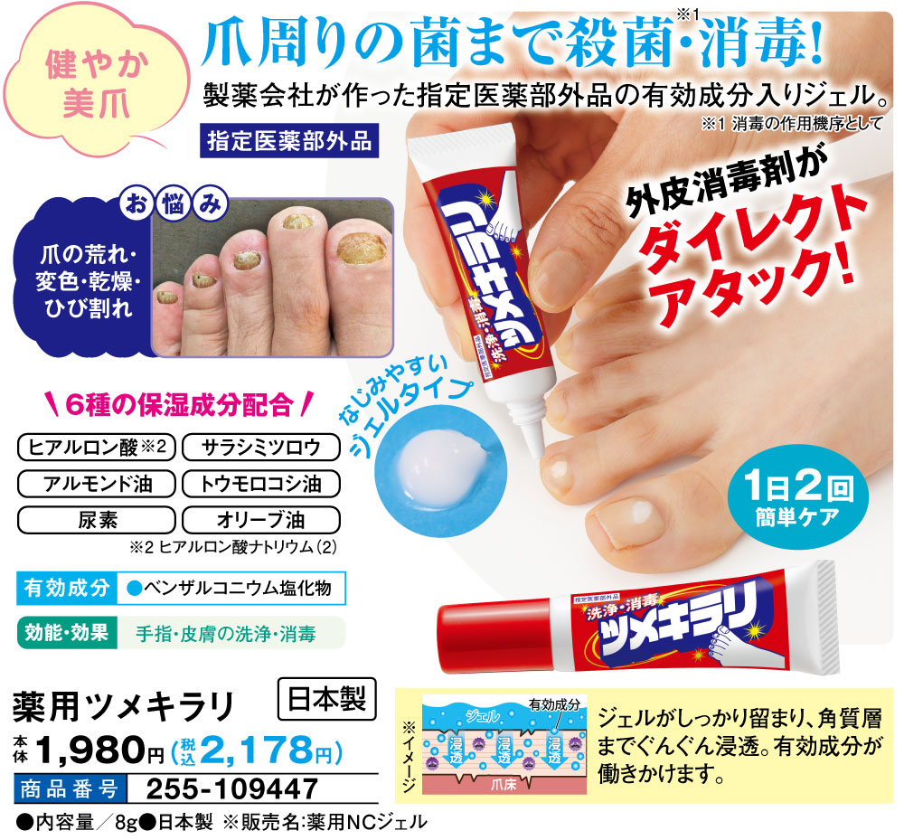 爪の中の菌まで殺菌・消毒! 有効成分が原因菌にダイレクトアタック! 製薬会社が作った薬用ジェル。 薬用ジェルが原因菌に効く! なじみやすいジェルタイプ 【薬用ならではの浸透力!】 ジェルがしっかり留まり、爪の中の角質層までぐんぐん浸透。有効成分が原因菌に働きかけます。 ※2 角質層まで 【お悩み】 爪の荒れ・変色・乾燥・ひび割れ 【6種の保湿成分配合】 ヒアルロン酸※1・サラシミツロウ・アルモンド油・トウモロコシ油・尿素・オリーブ油 【有効成分】 ベンザルコニウム塩化物 【効能・効果】 手指・皮膚の洗浄・消毒 ●指定医薬部外品 ●1日2回簡単ケア ●ネイルケア