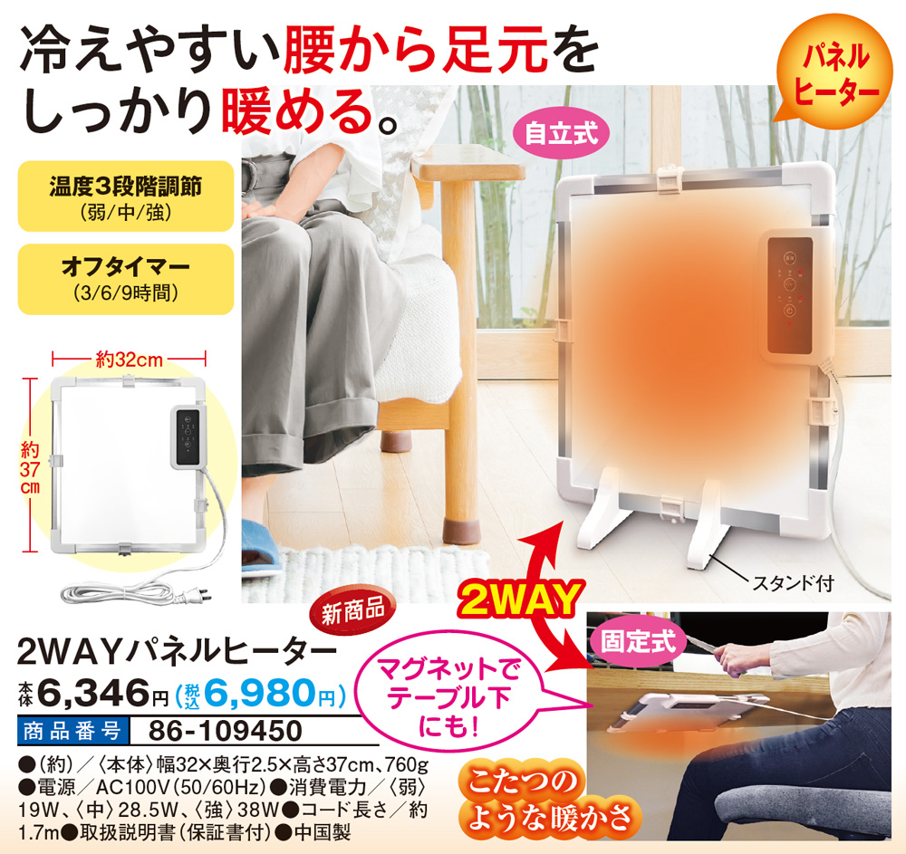 冷えやすい腰から足元をしっかり暖める! パネルヒーター こたつのような暖かさ 温度3段階調節(弱/中/強) オフタイマー(3/6/9時間) スタンド付 マグネットでテーブル下にも! ●自立式 ●固定式