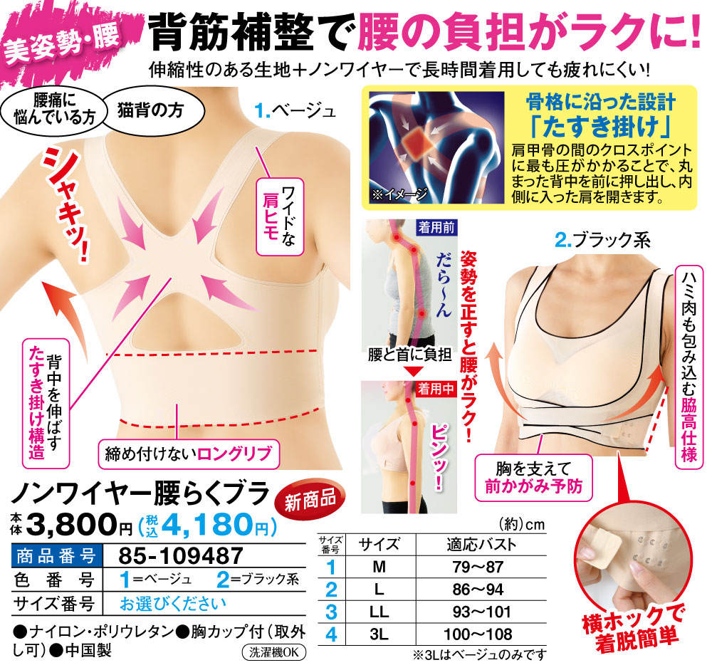 背筋を補整し腰の負担が楽になるブラ! 猫背の方!腰痛に悩んでいる方! ハミ肉も包み込む脇高仕様。 胸を支えて前かがみ予防。 締め付けないロングリブ。 背中を伸ばすたすき掛け構造。 ワイドな肩紐。