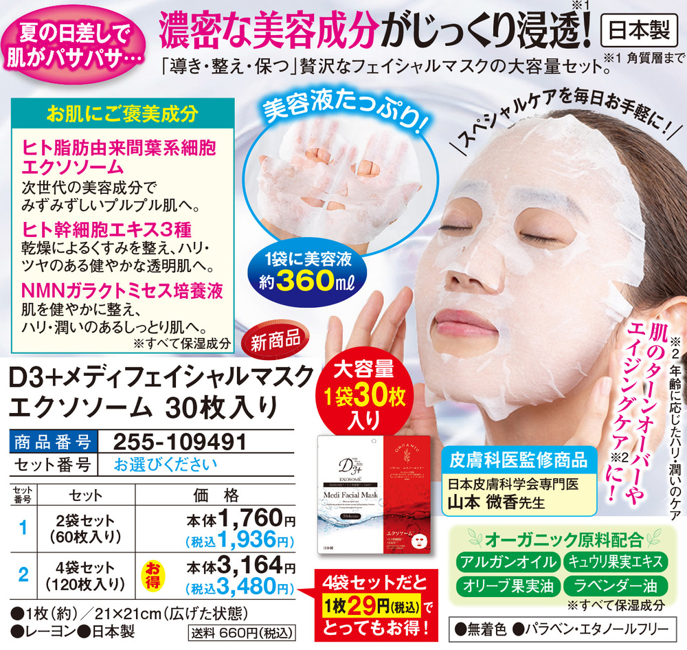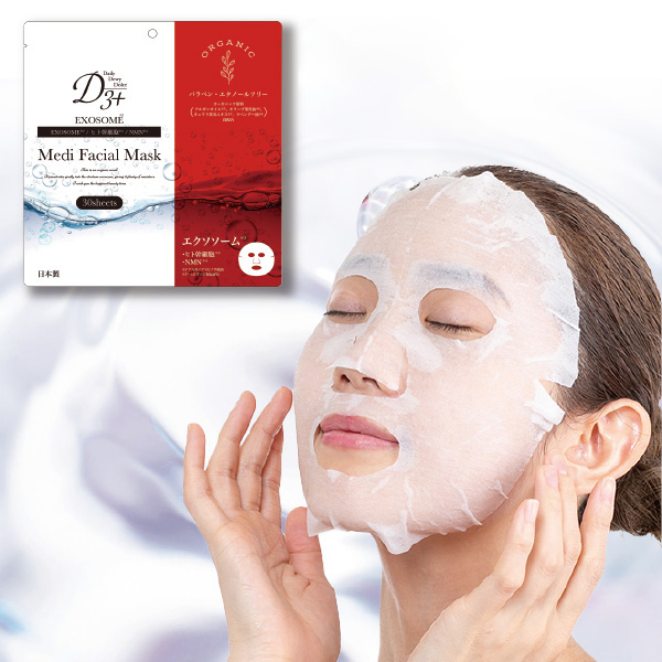 夏の日差しで肌がパサパサ…!濃密な美容成分がじっくり浸透(※1)! 「導き・整え・保つ」贅沢なフェイシャルマスクの大容量セット。 スペシャルケアを毎日お手軽に! 肌のターンオーバーやエイジングケア(※2)に! 【お肌にご褒美成分】 <ヒト脂肪由来間葉系細胞エクソソーム> 次世代の美容成分でみずみずしいプルプル肌へ。 <ヒト幹細胞エキス3種> 乾燥によるくすみを整え、ハリ・ツヤのある健やかな透明肌へ。 <NMNガラクトミセス培養液> 肌を健やかに整え、ハリ・潤いのあるしっとり肌へ。 ※すべて保湿成分 【美容液たっぷり!】 ●1袋に美容液約360ml ●大容量1袋30枚入り 【皮膚科医監修商品】 日本皮膚科学会専門医 山本 微香 先生 【オーガニック原料配合】 ●アルガンオイル ●キュウリ果実エキス ●オリーブ果実油 ●ラベンダー油 ※すべて保湿成分 ●無着色 ●パラベン・エタノールフリー ※1 角質層まで ※2 年齢に応じたハリ・潤いのケア