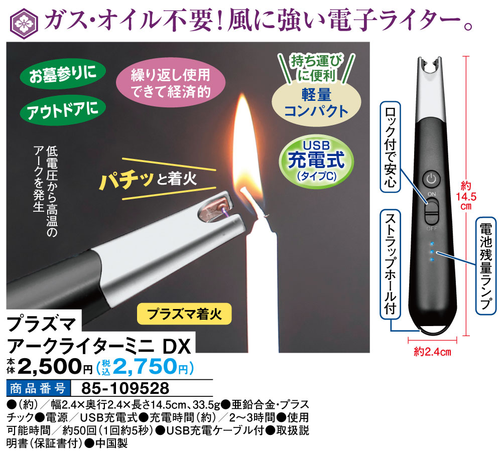ガス・オイル不要!風に強い電子ライター! 繰り返し使用できて経済的 お墓参りに、アウトドアに パチッと着火 低電圧から高温のアークを発生 電池残量がわかるインジケーターランプ ・ロック付で安心 ・ストラップホール付 持ち運びに便利 ●軽量コンパクト ●USB充電式(タイプC) ●プラズマ着火