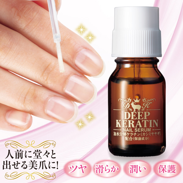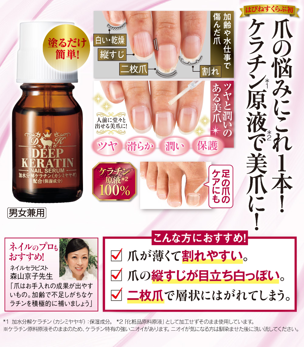 爪の悩みにこれ一本! ケラチン(*1)原液(*2)で美爪に。 ◎ケラチン原液100%美容液 ◎カシミアコートケラチン使用 ◎爪に塗るだけ! 爪の老化現象にはケラチン! 爪は毛髪と同じくケラチンというたんぱく質でできていますが、加齢により劣化します。 *1 加水分解ケラチン(カシミヤヤギ):保湿成分。 *2「化粧品原料原液」として加工せずそのまま使用しています。