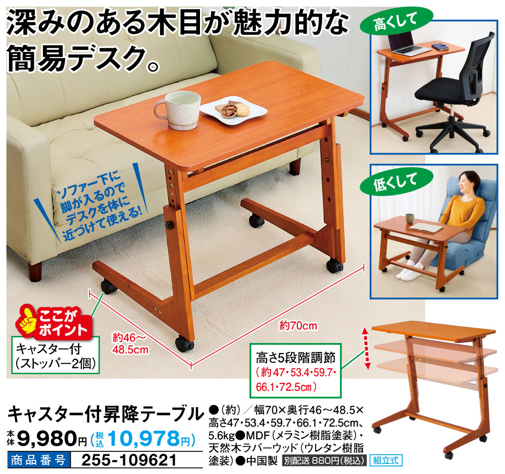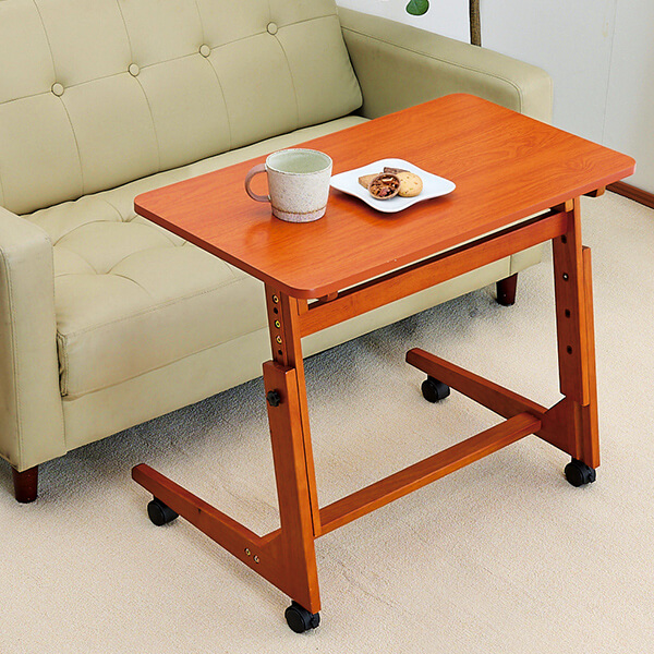 深みのある木目が魅力的な簡易デスク! ソファー下に脚が入るのでデスクを体に近づけて使える! 高さ5段階調節(約47・53.4・59.7・66.1・72.5cm) ●高くして ●低くして 【ここがポイント】 キャスター付(ストッパー2個)