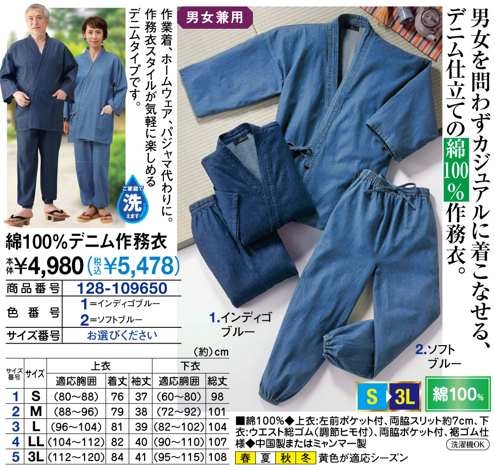 男女を問わずカジュアルに着こなせる、デニム仕立ての綿100%作務衣! 作業着、ホームウェア、パジャマ代わりに。 作務衣スタイルが気軽に楽しめるデニムタイプです。 ●男女兼用 ●S~3L