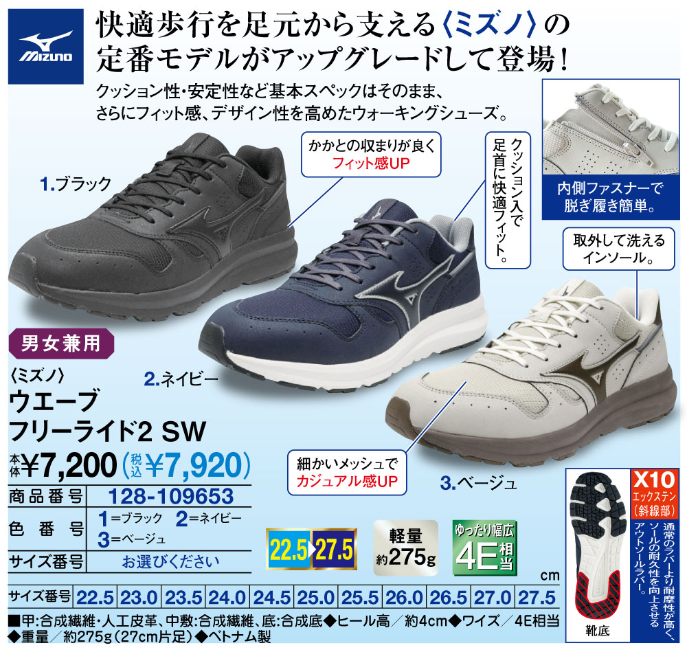 快適歩行を足元から支える<ミズノ>の定番モデルがアップグレードして登場! クッション性・安定性など基本スペックはそのまま、さらにフィット感、デザイン性を高めたウォーキングシューズ。 ・かかとの収まりが良くフィット感UP ・クッション入で足首に快適フィット。 ・取外して洗えるインソール。 ・細かいメッシュでカジュアル感UP ・内側ファスナーで脱ぎ履き簡単。 【X10エックステン】 摩擦に強く、シューズの耐久性も高めるアウトソールラバー。 ●ゆったり幅広4E相当 ●軽量約275g ●22.5~27.5cm ●男女兼用