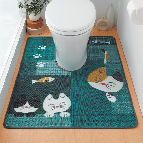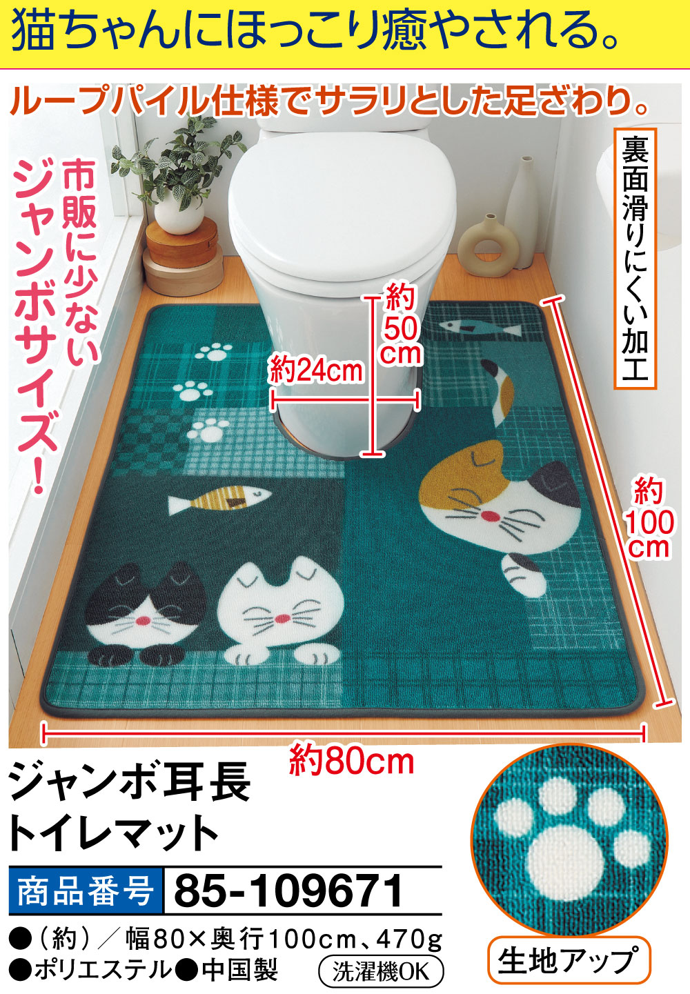 猫ちゃんにほっこり癒やされるジャンボサイズのトイレマット! ループパイル仕様でサラリとした足ざわり。 市販に少ないジャンボサイズ! 裏面滑りにくい加工