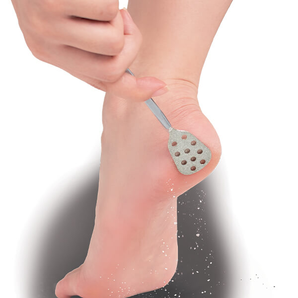 これ1本で足裏ツルスベ! かかとの研磨や角質のポイント削りができる足裏ケアグッズ。 ダイヤモンド研磨剤と10穴のエッジ効果で軽~く擦るだけでなめらか! 【便利な3way!】 【表】フラットヘッド仕上げ面:なめらかに仕上げる 【裏】フラットヘッドハード面:ガサガサを磨き削る 【ピンポイントヘッド】盛り上がった角質を除去 【ダイヤモンド研磨剤使用】 地球上で最も硬いダイヤモンドを粒子にしてステンレス表面に加工。 ガサガサかかとがツルスベに! 爪ヤスリとしても ●フットケア