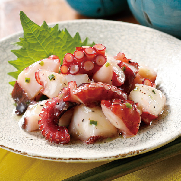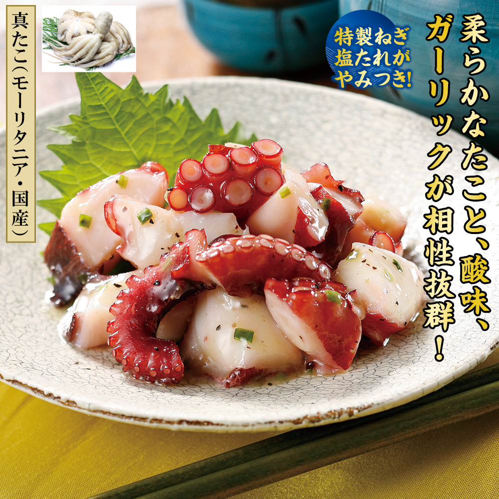 【真たこ(モーリタニア・国産)】 特製ねぎ塩たれがやみつき! ボイルしたたこを食べやすくカットし、特製のねぎ塩たれで和えました。 解凍後そのままでも、炒め物やお酒のおつまみにもどうぞ。