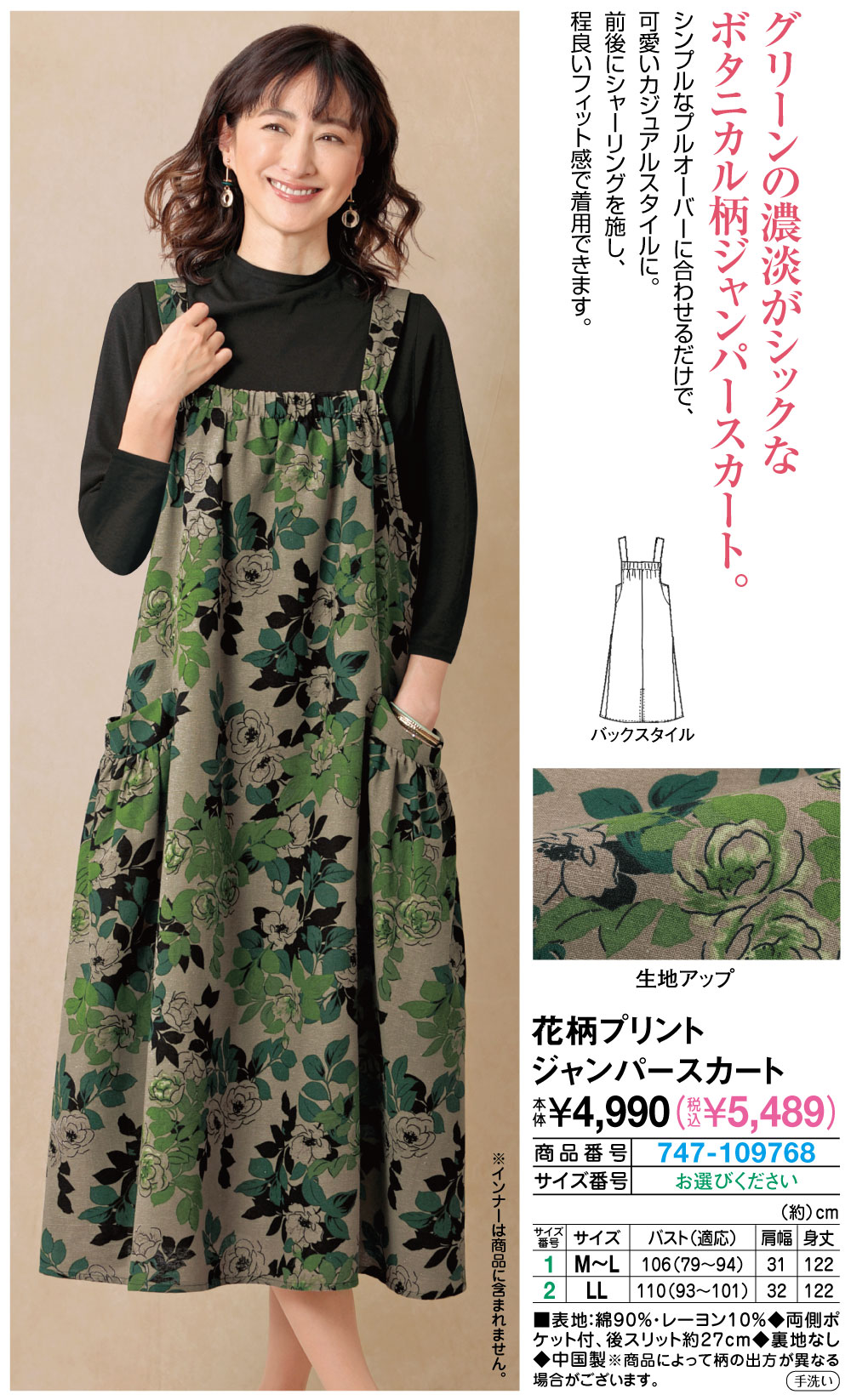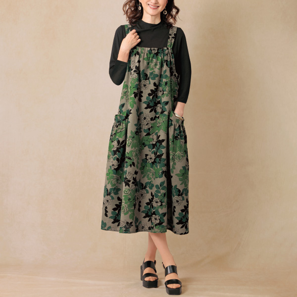 グリーンの濃淡がシックなボタニカル柄ジャンパースカート。 シンプルなTシャツに合わせても、可愛いカジュアルスタイルに。 前後にシャーリングを施し、程良いフィット感で着用できます。