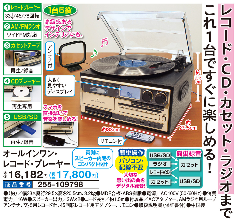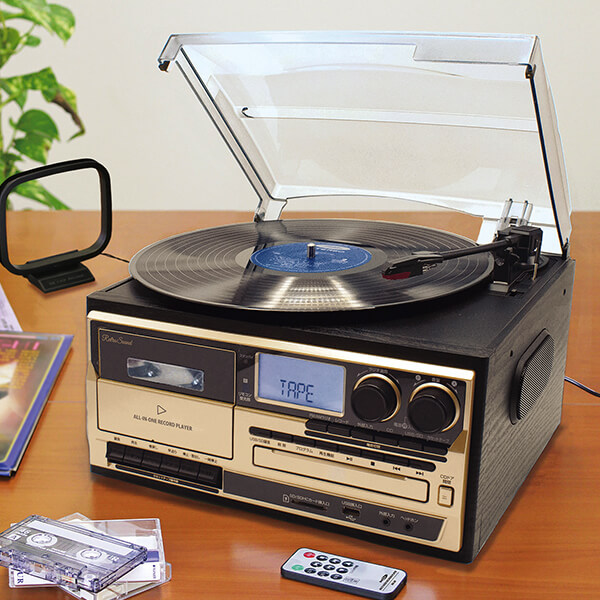 レコード・CD・カセット・ラジオまで これ1台ですぐに楽しめる! 1台5役 (1)レコードプレーヤー 33 1/3/45/78回転 (2)AM/FMラジオ ワイドFM対応 (3)カセットテープ 再生/録音 (4)CDプレーヤー 再生専用 (5)USB/SD 再生/録音 高級感あるデザインでインテリアにも。 スマホを直接繋いで音楽を楽しめる! 両側にスピーカー内蔵のコンパクト設計 簡単操作 パソコン・配線不要 大切な思い出の曲をデジタル録音! 【簡単録音】 ●USB/SD → カセット ●ラジオ → カセット ●レコード/CD → カセット/USB/SD ●カセット → USB/SD アンテナ付 大きく見やすいディスプレイ リモコン付