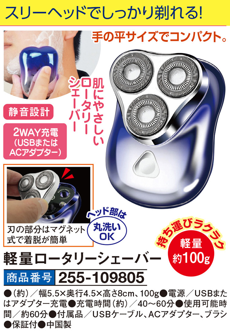 スリーヘッドでしっかり剃れる! 手の平サイズでコンパクト。 肌にやさしいロータリーシェーバー 刃の部分はマグネット式で着脱が簡単 ヘッド部は丸洗いOK 持ち運びラクラク 軽量 約100g ●静音設計 ●2WAY充電(USBまたはACアダプター)