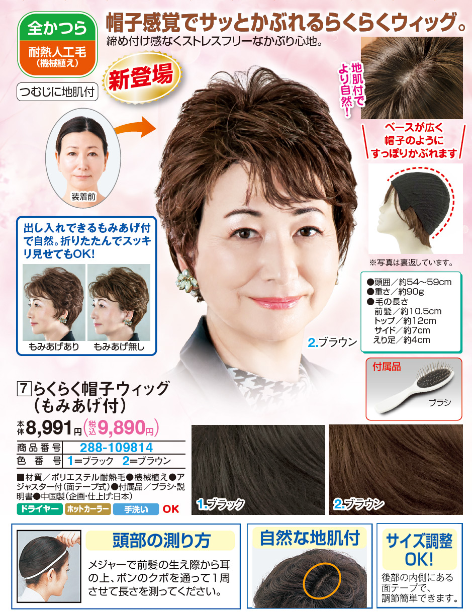 帽子感覚でサッとかぶれるらくらくウィッグ。 締め付け感なくストレスフリーなかぶり心地。 つむじに地肌付! ベースが広く帽子のようにすっぽりかぶれます。 出し入れできるもみあげ付で自然。 折りたたんでスッキリ見せてもOK!
