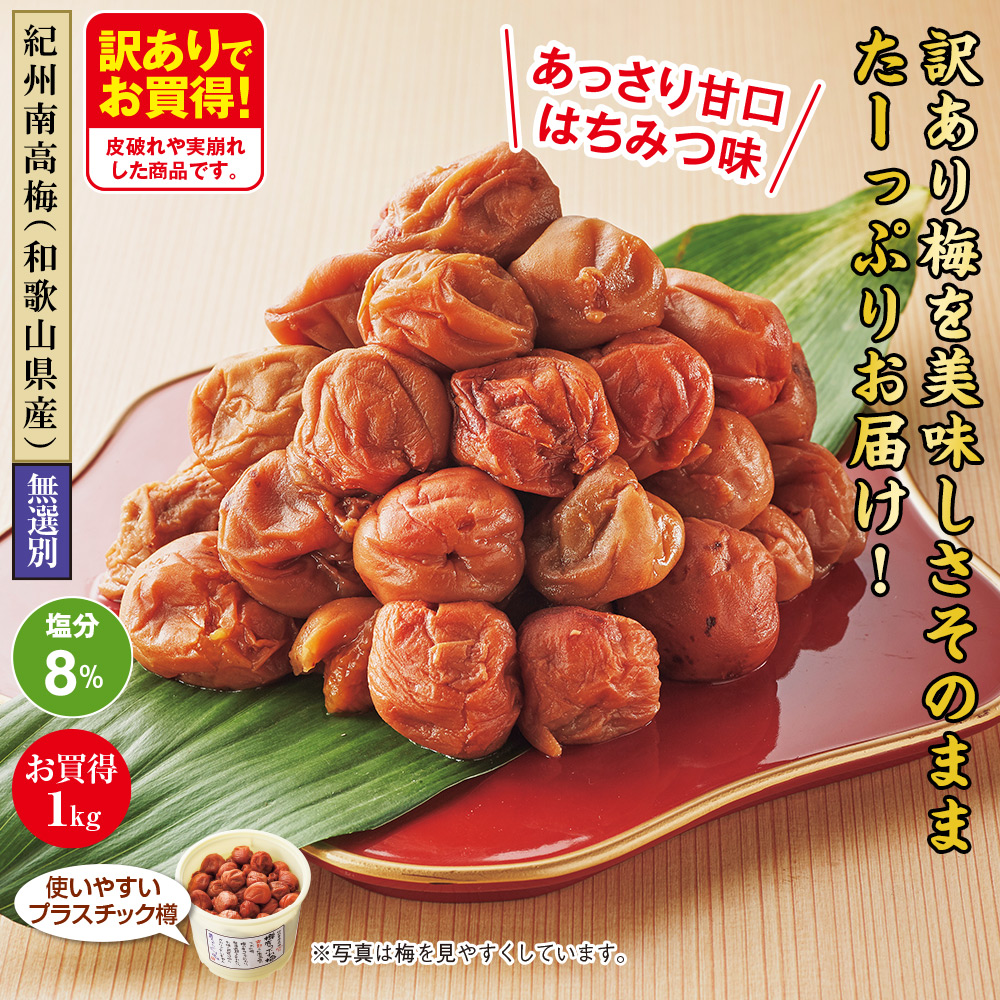 紀州南高梅(和歌山県産) 無選別 あっさり甘口はちみつ味。 訳ありでお買得! 皮破れや実崩れした商品です。 塩分8%