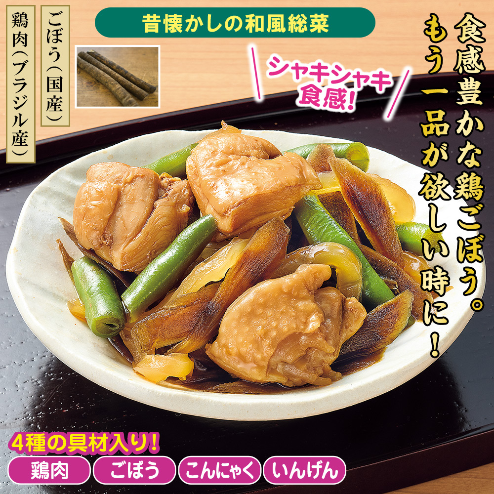 【鶏肉(ブラジル産)】【ごぼう(国産)】 昔懐かしの和風総菜。 少し甘めのかつお出汁ベースの特製たれが、鶏とごぼうの旨みを引き立たせます。ご飯がすすむ一品です。 シャキシャキ食感! 4種の具材入り! ・鶏肉・ごぼう・こんにゃく・いんげん