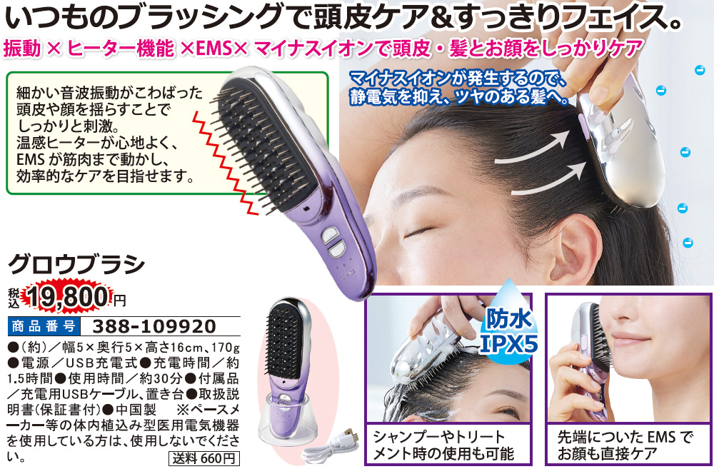 振動×ヒーター機能×EMS×マイナスイオンで頭皮・髪とお顔をしっかりケア。 マイナスイオンが発生するので、静電気を抑え、ツヤのある髪へ。 ◎防水IPX5