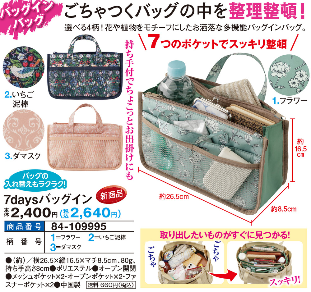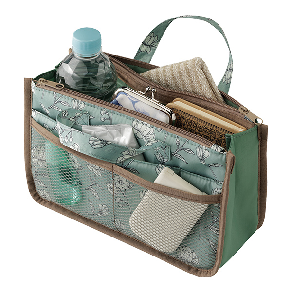 ごちゃつくバッグの中を整理整頓! 選べる4柄!花や植物をモチーフにしたお洒落な多機能バッグインバッグ。 7つのポケットでスッキリ整頓! 取り出したいものがすぐに見つかる! バッグの入れ替えもラクラク! 持ち手付でちょこっとお出掛けにも ●バッグインバッグ