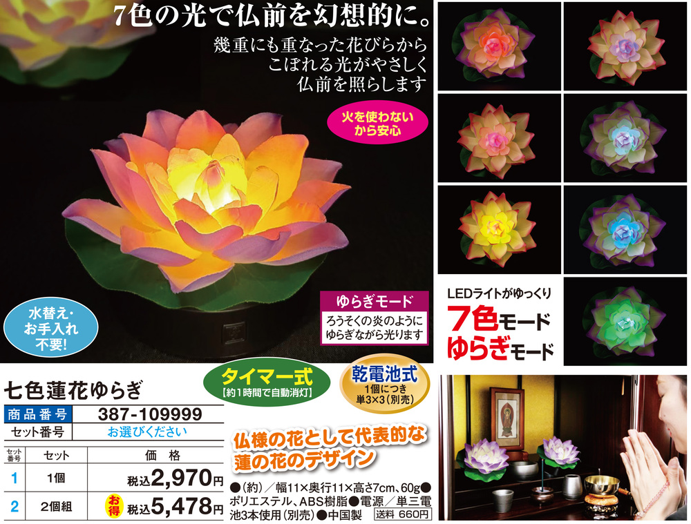 ●幾重にも重なった花びらからこぼれる光がやさしく仏前を照らします ●火を使わないから安心 ●水替え・お手入れ不要! 【ゆらぎモード】 ろうそくの炎のようにゆらぎながら光ります ●仏様の花として代表的な蓮の花のデザイン LEDライトがゆっくり 7色モード ゆらぎモード