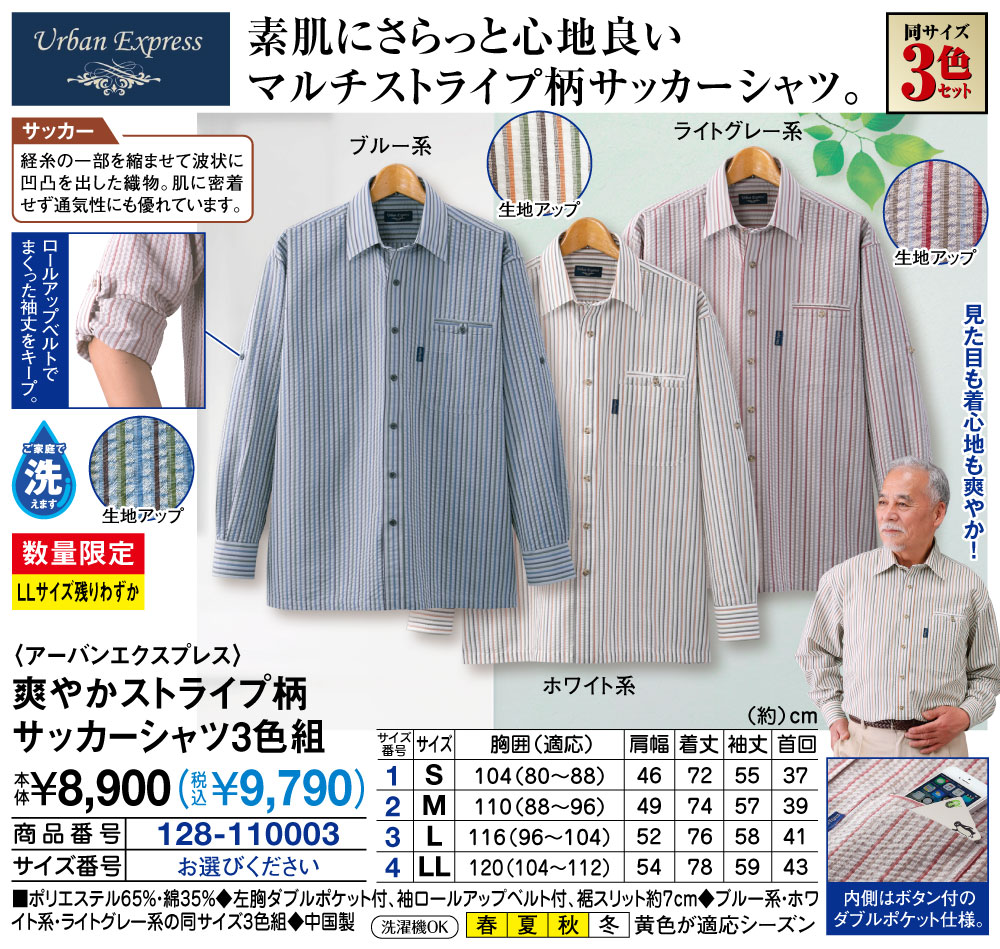 【サイズ(約)】 胸囲(適応)、肩幅、着丈、袖丈、首回 <S>104(80~88)cm、46cm、72cm、55cm、37cm <M>110(88~96)cm、49cm、74cm、57cm、39cm <L>116(96~104)cm、52cm、76cm、58cm、41cm <LL>120(104~112)cm、54cm、78cm、59cm、43cm ■ポリエステル65%・綿35% ◆左胸ダブルポケット付、袖ロールアップベルト付、裾スリット約7cm ◆ブルー系・ホワイト系・ライトグレー系の同サイズ3色組 ◆中国製