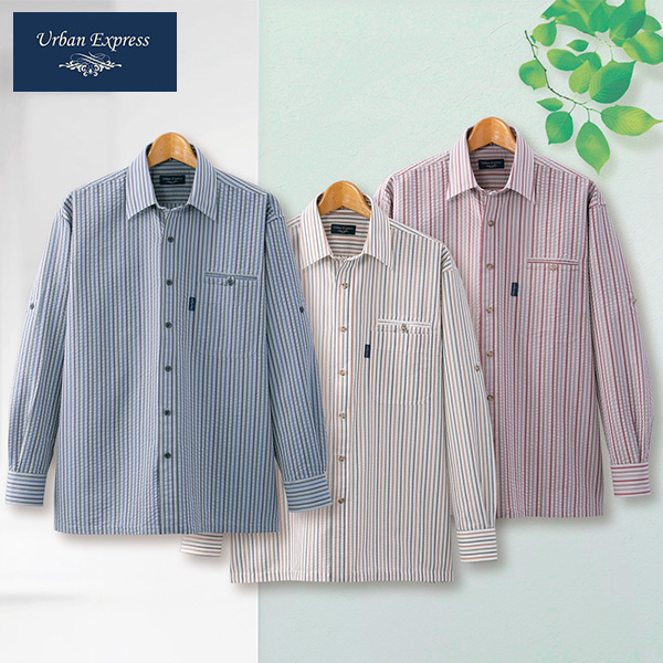 素肌にさらっと心地良いマルチストライプ柄サッカーシャツ! 見た目も着心地も爽やか! ロールアップベルトで、まくった袖丈をキープ。 内側はボタン付のダブルポケット仕様。 【サッカー】 経糸の一部を縮ませて波状に凹凸を出した織物。肌に密着せず通気性にも優れています。 ●長袖 ●同サイズ3色セット