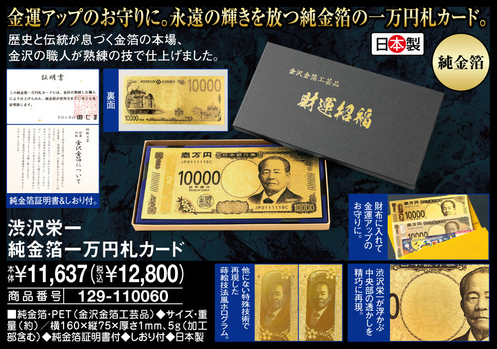 金運アップのお守りに。 永遠の輝きを放つ純金箔の一万円札カード。 歴史と伝統が息づく金箔の本場、金沢の職人が熟練の技で仕上げた一万円の新札カード。 純金箔証明書&しおり付。