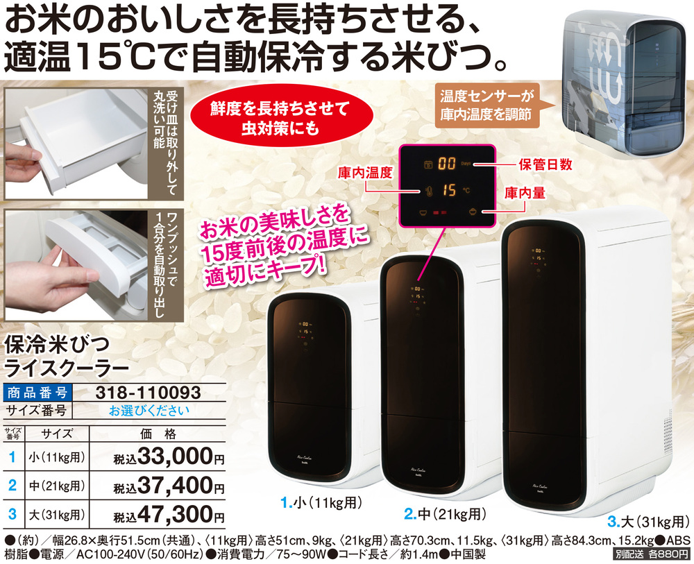 ●鮮度を長持ちさせて虫対策にも ●温度センサーが庫内温度を調節 ●お米の美味しさを15度前後の温度に適切にキープ! ●受け皿は取り外して丸洗い可能 ●ワンプッシュで1合分を自動取り出し