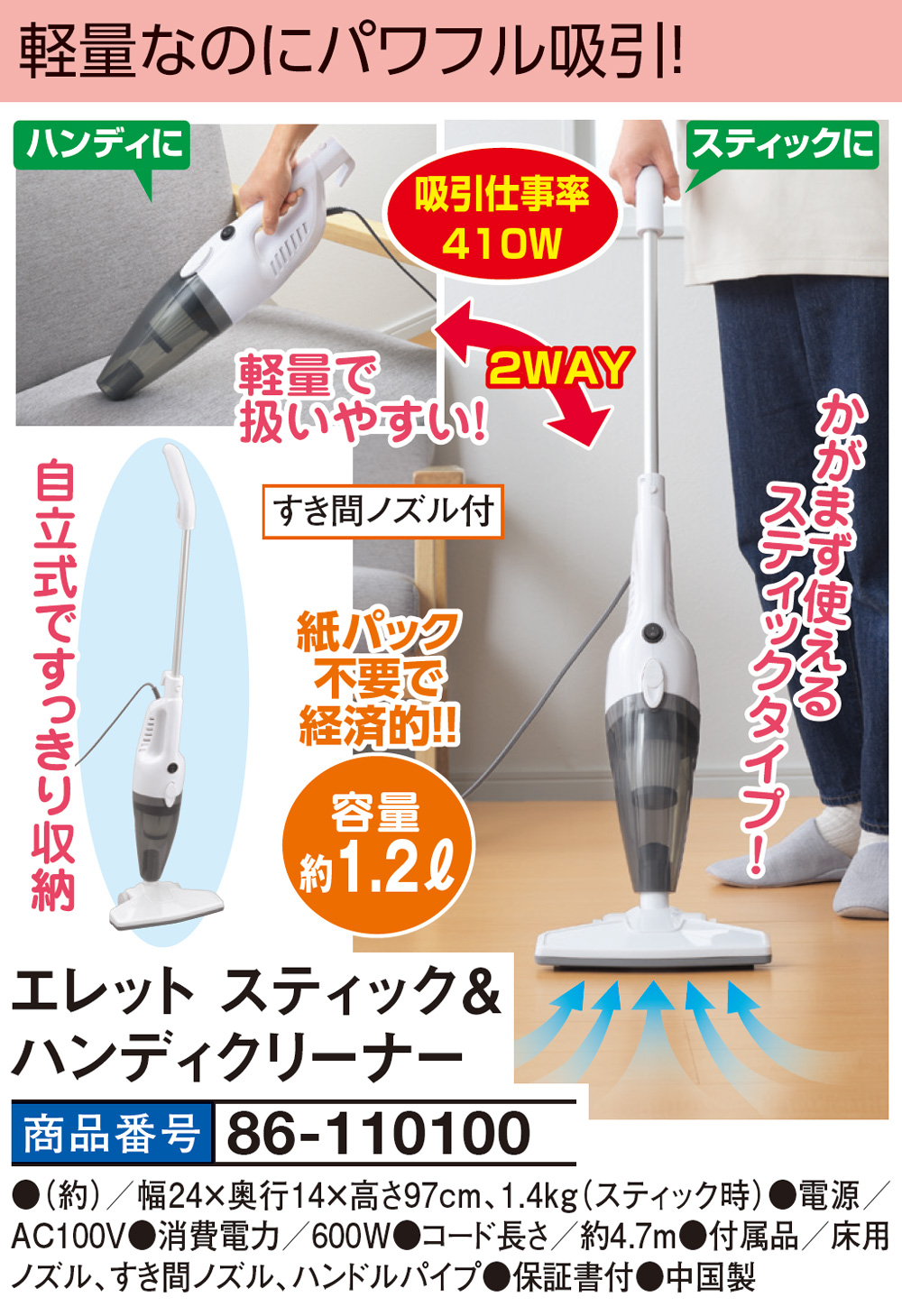 軽量なのにパワフル吸引! ●ハンディに ●スティックに ●吸引仕事率 410W 2WAY 軽量で扱いやすい! かがまず使えるスティックタイプ! 自立式ですっきり収納 紙パック不要で経済的!! ●すき間ノズル付 ●容量 約1.2L