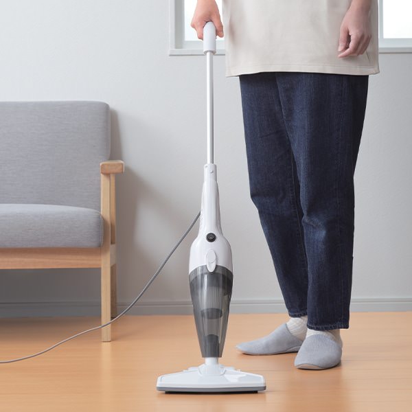 ●(約)/幅24×奥行14×高さ97cm、1.4kg(スティック時) ●電源/AC100V ●消費電力/600W ●コード長さ/約4.7m ●付属品/床用ノズル、すき間ノズル、ハンドルパイプ ●保証書付 ●中国製