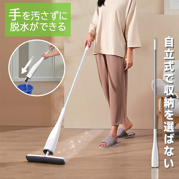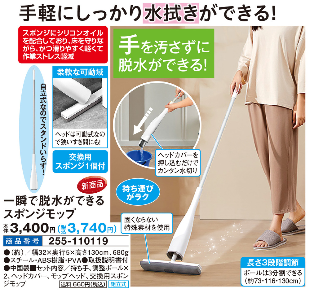 手軽にしっかり水拭きができる! スポンジにシリコンオイルを配合しており、床を守りながら、かつ滑りやすく軽くて作業ストレス軽減 固くならない特殊素材を使用 【手を汚さずに脱水ができる!】 ヘッドカバーを押し込むだけでカンタン水切り 【柔軟な可動域】 ヘッドは可動式なので狭いすき間にも! 【長さ3段階調節】 ポールは3分割できる(約73・116・130cm) 自立式なのでスタンドいらず! ●持ち運びがラク ●交換用スポンジ1個付