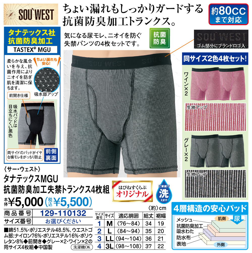 ちょい漏れもしっかりガードする抗菌防臭加工トランクス! 気になる尿モレ、ニオイを防ぐ失禁パンツの4枚セットです。 ゴム部分にブランドロゴ入 4層構造の安心パッド 【タナテックス社 抗菌防臭加工】 ・柔らかな風合いを与え、抗菌作用によりニオイを防ぎ肌を清潔に保ちます。 ・吸水パッドは目立ちにくい黒色 ●同サイズ4枚新色セット ●約80CCまで対応 ●抗菌防臭