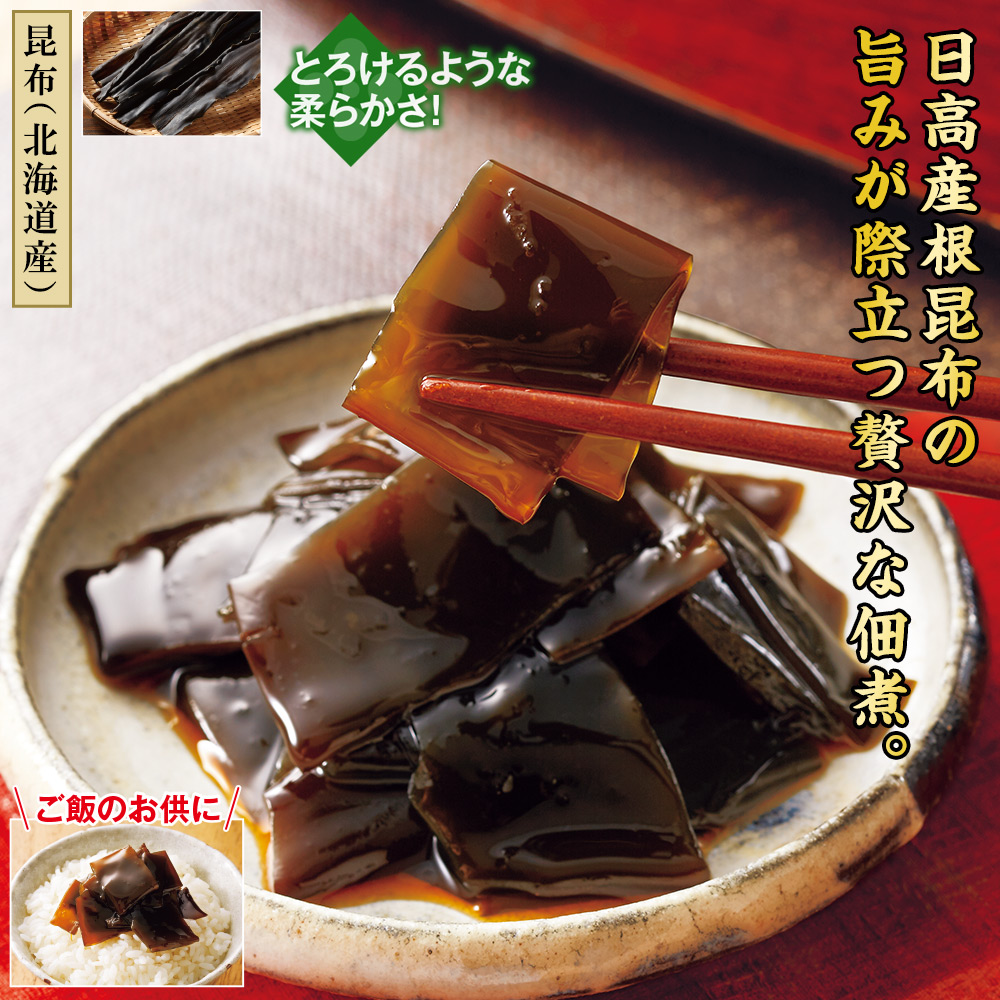 【昆布(北海道産)】 とろけるような柔らかさ! 厚みのある根昆布の旨みを引き出し、砂糖・醤油・みりんだけで味付けしました。ご飯やお酒のお供にぴったりです。