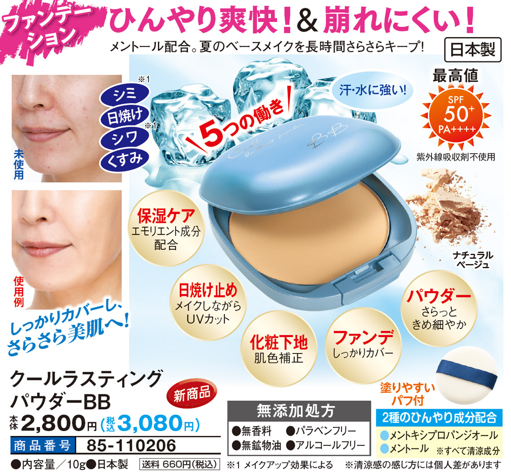 ひんやり爽快!&崩れにくい! メントール配合。夏のベースメイクを長時間さらさらキープ! シミ(※1)、日焼け、シワ(※1)、くすみ しっかりカバーし、さらさら美肌へ! (※1)メイクアップ効果による ●汗・水に強い! ●最高値:SPF50+ PA++++ 紫外線吸収剤不使用 \5つの働き/ 保湿ケア:エモリエント成分配合 日焼け止め:メイクしながらUVカット 化粧下地:肌色補正 ファンデ:しっかりカバー パウダー:さらっときめ細やか 塗りやすいパフ付 【2種のひんやり成分配合】 メントキシプロパンジオール、メントール ※すべて清涼成分 【無添加処方】 無香料 、無鉱物油、パラベンフリー、アルコールフリー ●ファンデーション