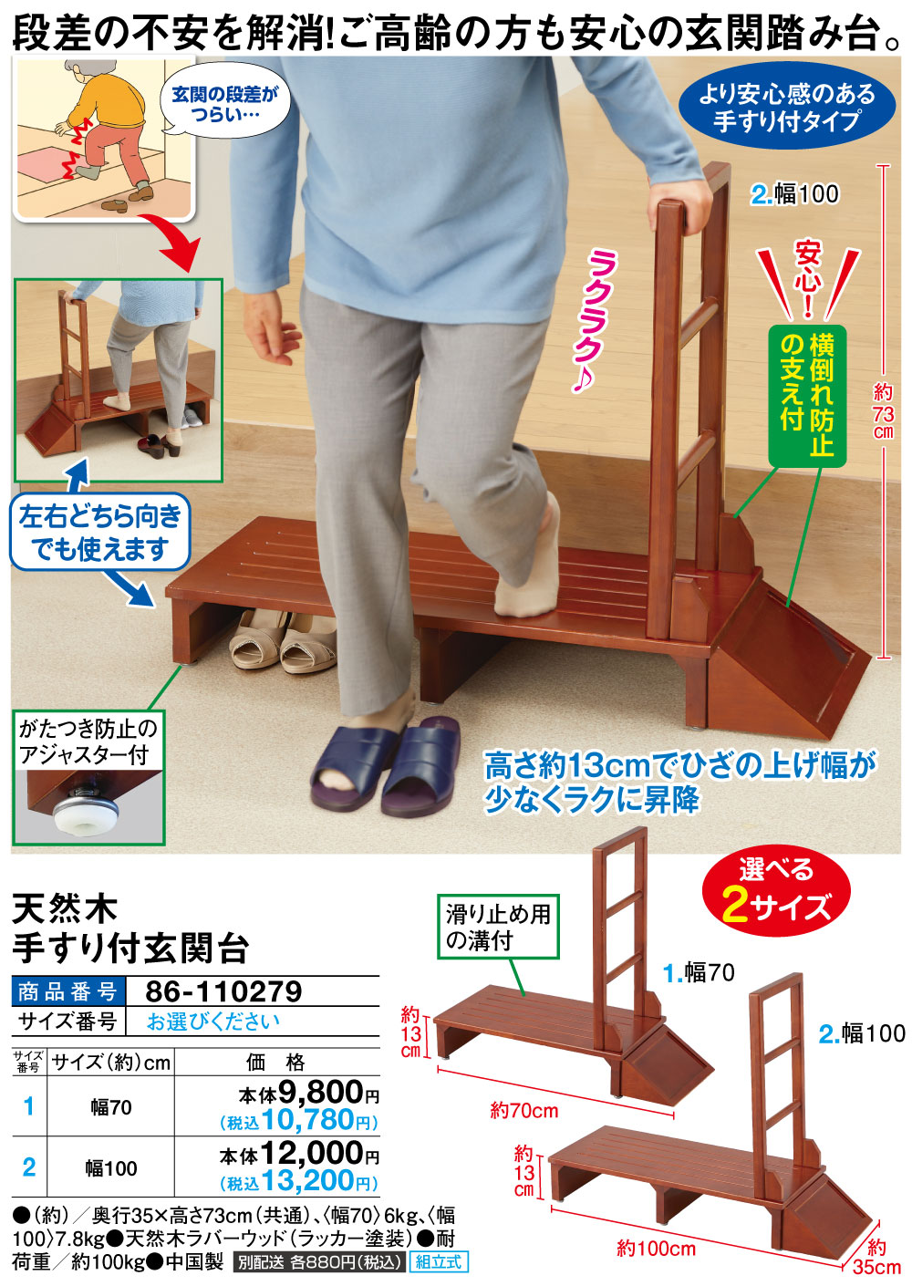足腰の負担を軽減!横倒れ防止設計で昇り降りを安全にサポート! 高さ約13cmでひざの上げ幅が少なくラクに昇降 左右どちら向きでも使えます \安心!/ 横倒れ防止の支え付 ●がたつき防止のアジャスター付 ●滑り止め用の溝付 ●選べる2サイズ