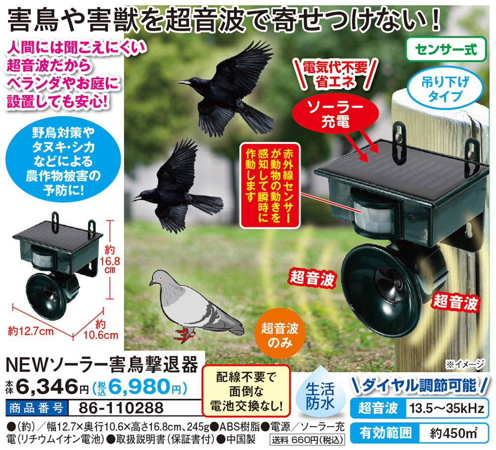 害鳥や害獣を超音波で寄せつけない! 人間には聞こえにくい超音波だからベランダやお庭に設置しても安心! 野鳥対策やタヌキ・シカなどによる農作物被害の予防に! 赤外線センサーが作動して動物の動きを感知し瞬時に作動します \電気代不要 省エネ/ ソーラー充電 配線不要で面倒な電池交換なし! ●センサー式 ●吊り下げタイプ ●生活防水 ●ダイヤル調節可能/超音波 13.5~35kHz 有効範囲 約450m2