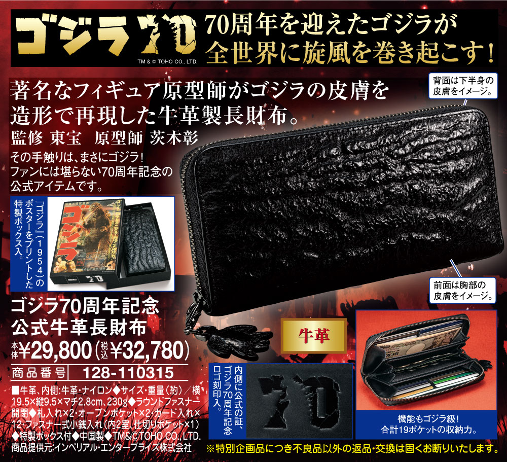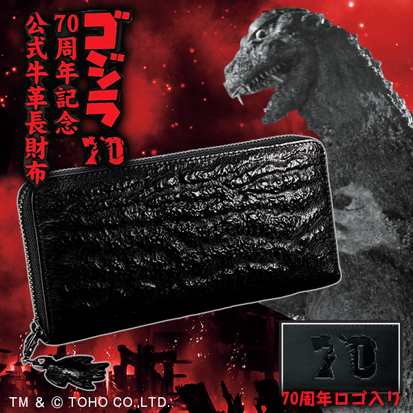 風格も機能もゴジラ級!大人にふさわしい長財布 ■ゴジラの皮膚を型押しで再現した高級牛革製 ■ 内側にはゴジラ70周年記念ロゴを刻印 ■『ゴジラ』(1954)のポスターがプリントされた特製ボックスに収めてお届け