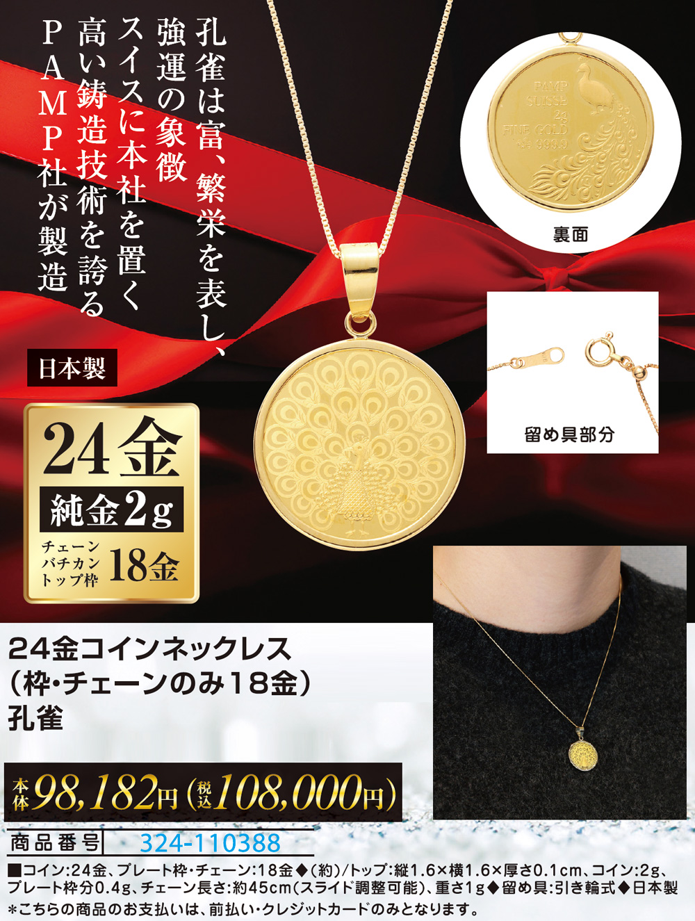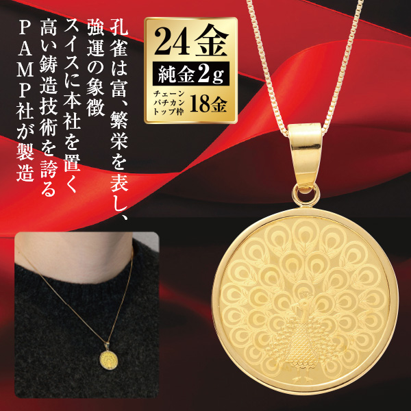 孔雀は富、繁栄を表し、強運の象徴。 スイスに本社を置く高い鋳造技術を誇るPAMP社が製造。 ◎24金 ◎純金2g ◎18金(チェーン・バチカン・トップ枠) ◎日本製