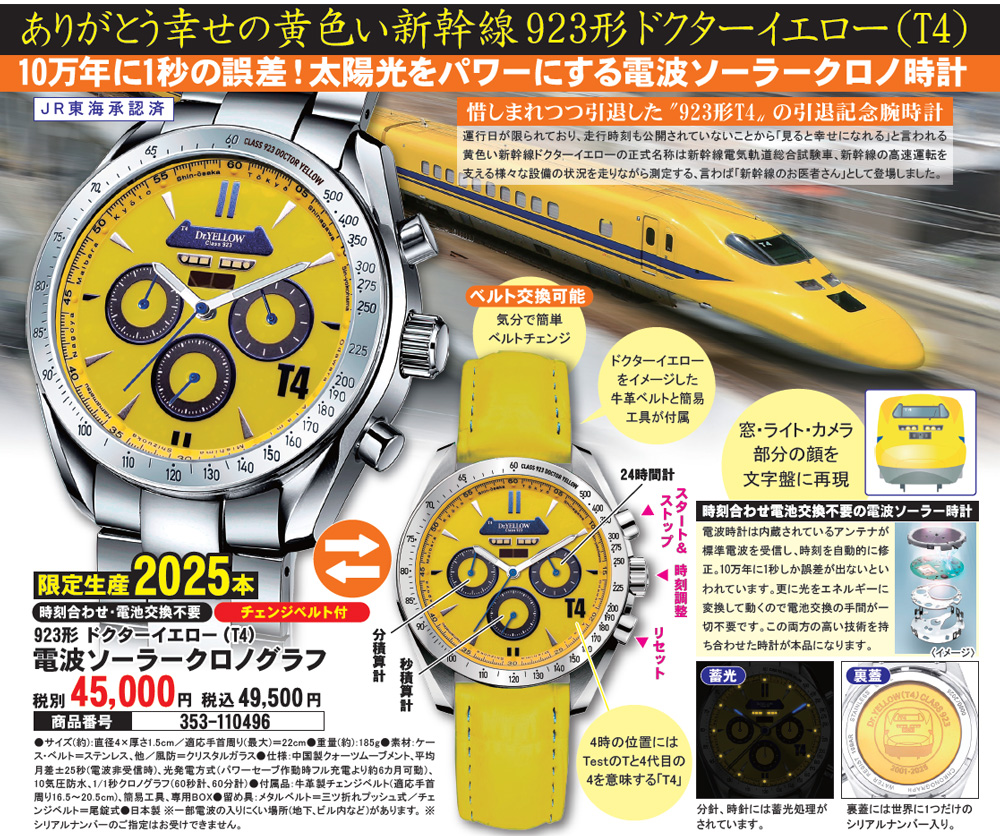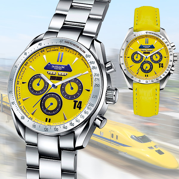 ありがとう幸せの黄色い新幹線 923形 ドクターイエロー(T4) 惜しまれつつ引退した「923形T4」の引退記念腕時計 運行日が限られており、走行時刻も公開されていないことから「見ると幸せになれる」と言われる黄色い新幹線ドクターイエローの正式名称は新幹線電気軌道総合試験車、新幹線の高速運転を支える様々な設備の状況を走りながら測定する、言わば「新幹線のお医者さん」として登場しました。 4時の位置にはTestのTと4代目の4を意味する「T4」 10万年に1秒の誤差!太陽光をパワーにする電波ソーラークロノ時計 時刻合わせ電池交換不要の電波ソーラー時計 電波時計は内蔵されているアンテナが標準電波を受信し、時刻を自動的に修正。 10万年に1秒しか誤差が出ないといわれています。 更に光をエネルギーに変換して動くので電池交換の手間が一切不要です。 この両方の高い技術を持ち合わせた時計が本品になります。 ベルト交換可能 気分で簡単ベルトチェンジ ドクターイエローをイメージした牛革ベルトと簡易工具が付属 窓・ライト・カメラ部分の顔を文字盤に再現 分針、時針には蓄光処理がされています。 裏蓋には世界に1つだけのシリアルナンバー入り。 J R 東海承認済 限定生産2025本