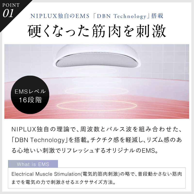 独自EMSで硬くなった首を徹底ケア! ・5種類のEMSモード ・3段階の温熱調整 首・肩・二の腕・上腕・ふくらはぎ・ふともも 柔軟ケーブルだからくるっと丸めてどこでも持ち運べます。