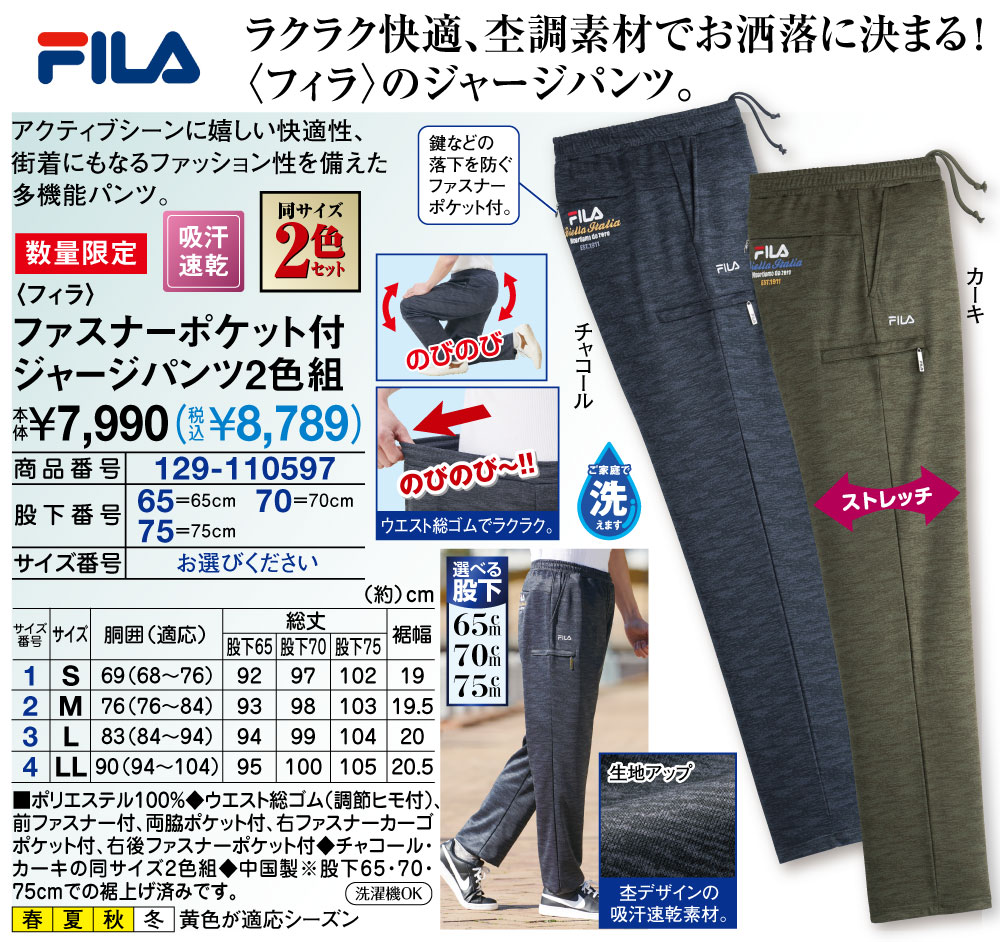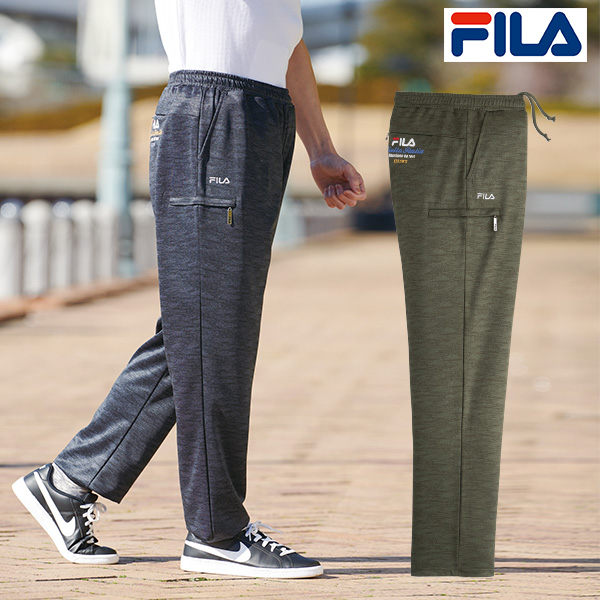 ラクラク快適、杢調素材でお洒落に決まる!<フィラ>のジャージパンツ! アクティブシーンに嬉しい快適性、街着にもなるファッション性を備えた多機能パンツ。 鍵などの落下を防ぐファスナーポケット付。 ウエスト総ゴムでラクラク。 杢デザインの吸汗速乾素材。 ●ストレッチ ●同サイズ2色セット ●吸汗速乾