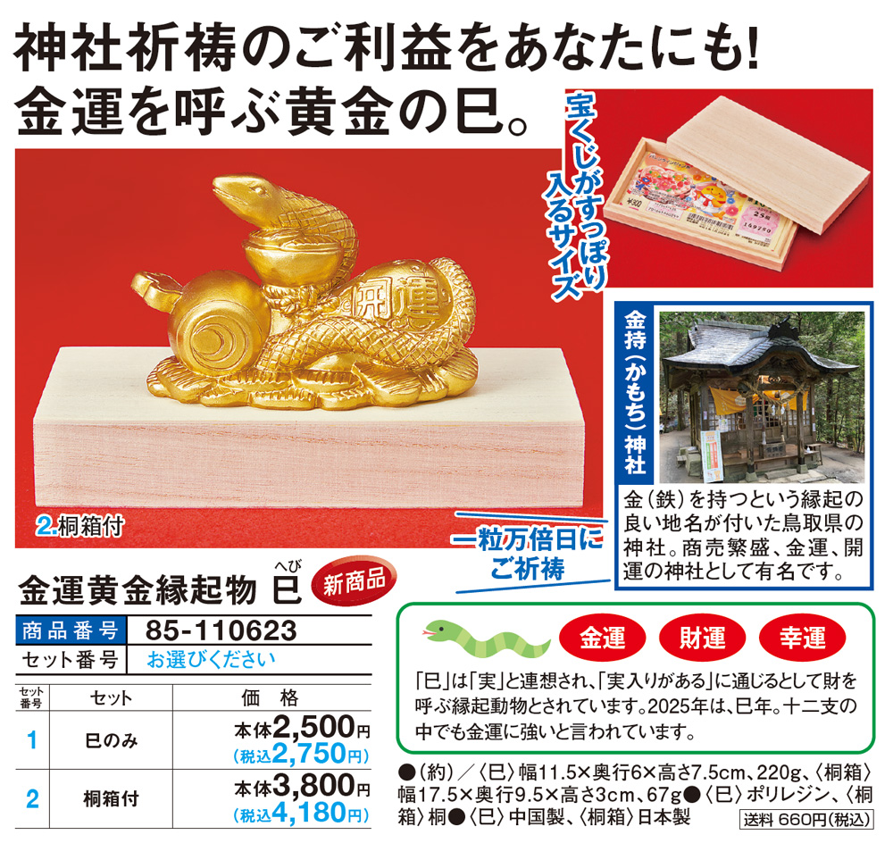 神社祈祷のご利益をあなたにも!金運を呼ぶ黄金の巳! 宝くじがすっぽり入るサイズ 【巳年】金運・財運・幸運 「巳」は「実」と連想され、「実入りがある」に通じるとして財を呼ぶ縁起動物とされています。 2025年は、巳年。 十二支の中でも金運に強いと言われています。 \一粒万倍日にご祈祷/ 【金持神社】 金(鉄)を持つという縁起の良い地名が付いた鳥取県の神社。 商売繁盛、金運、開運の神社として有名です。