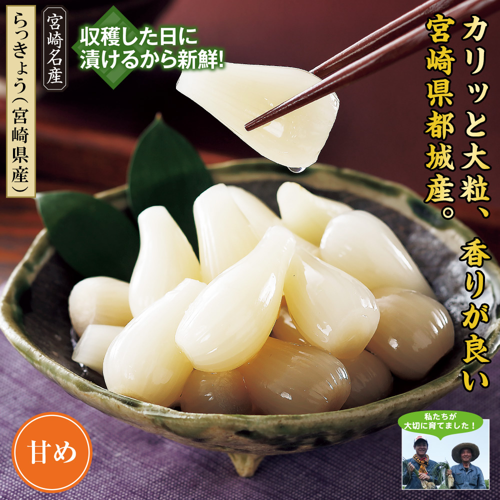 【らっきょう(宮崎県産)】 宮崎名産。 収穫した日に漬けるから新鮮! 霧島盆地の肥沃な土壌と太陽に育まれたらっきょう。 収穫後すぐに低温・低塩で漬け込むので食べやすく、独特の香りと歯ごたえが楽しめます。