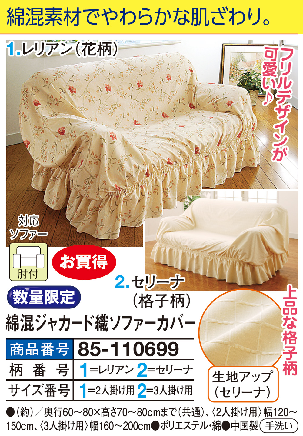 綿混素材でやわらかな肌ざわり! レリアン(花柄):フリルデザインが可愛い♪ セリーナ:上品な格子柄 ●対応ソファー:肘付