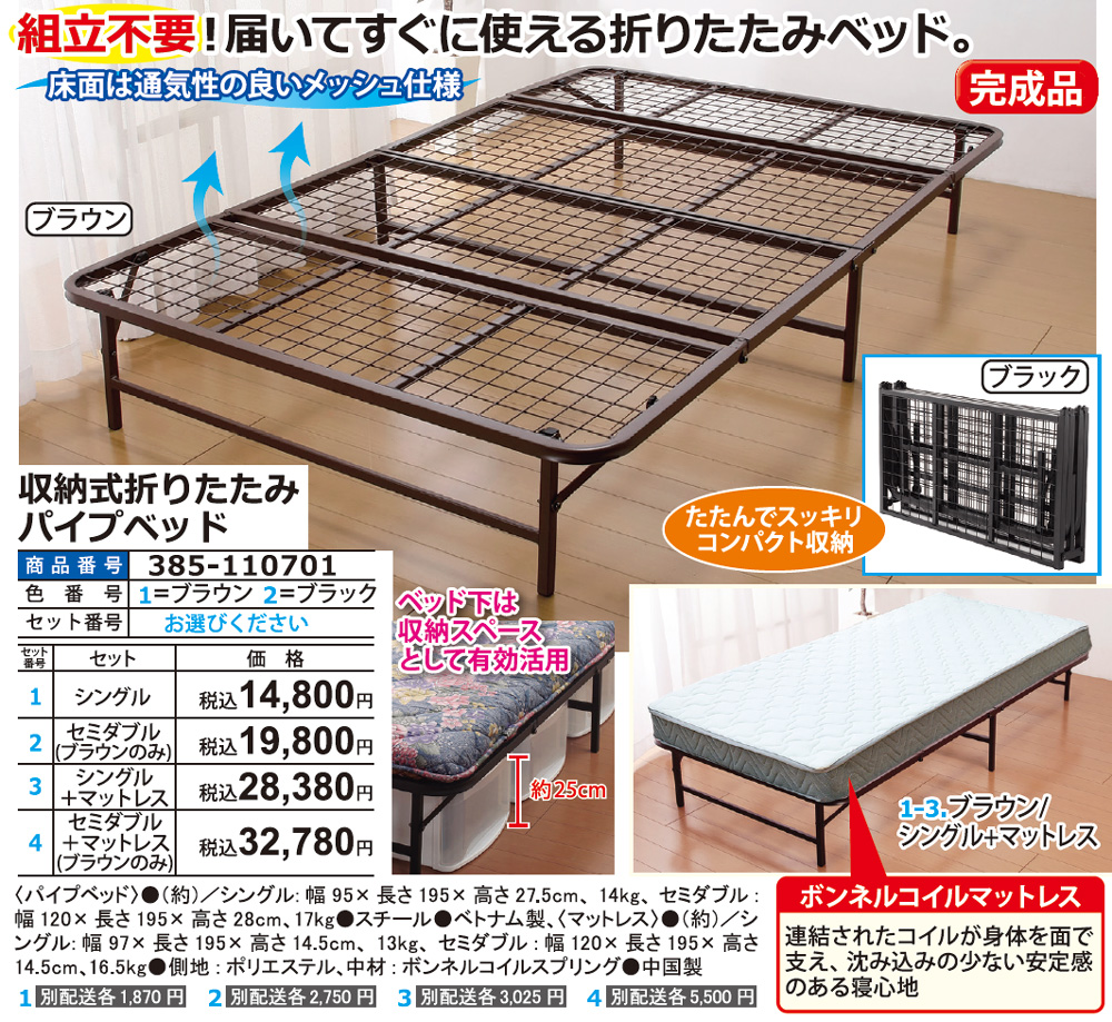 床面は通気性の良いメッシュ仕様 ベッド下は収納スペースとして有効活用 たたんでスッキリコンパクト収納 【ボンネルコイルマットレス】 連結されたコイルが身体を面で支え、沈み込みの少ない安定感のある寝心地 ◎完成品