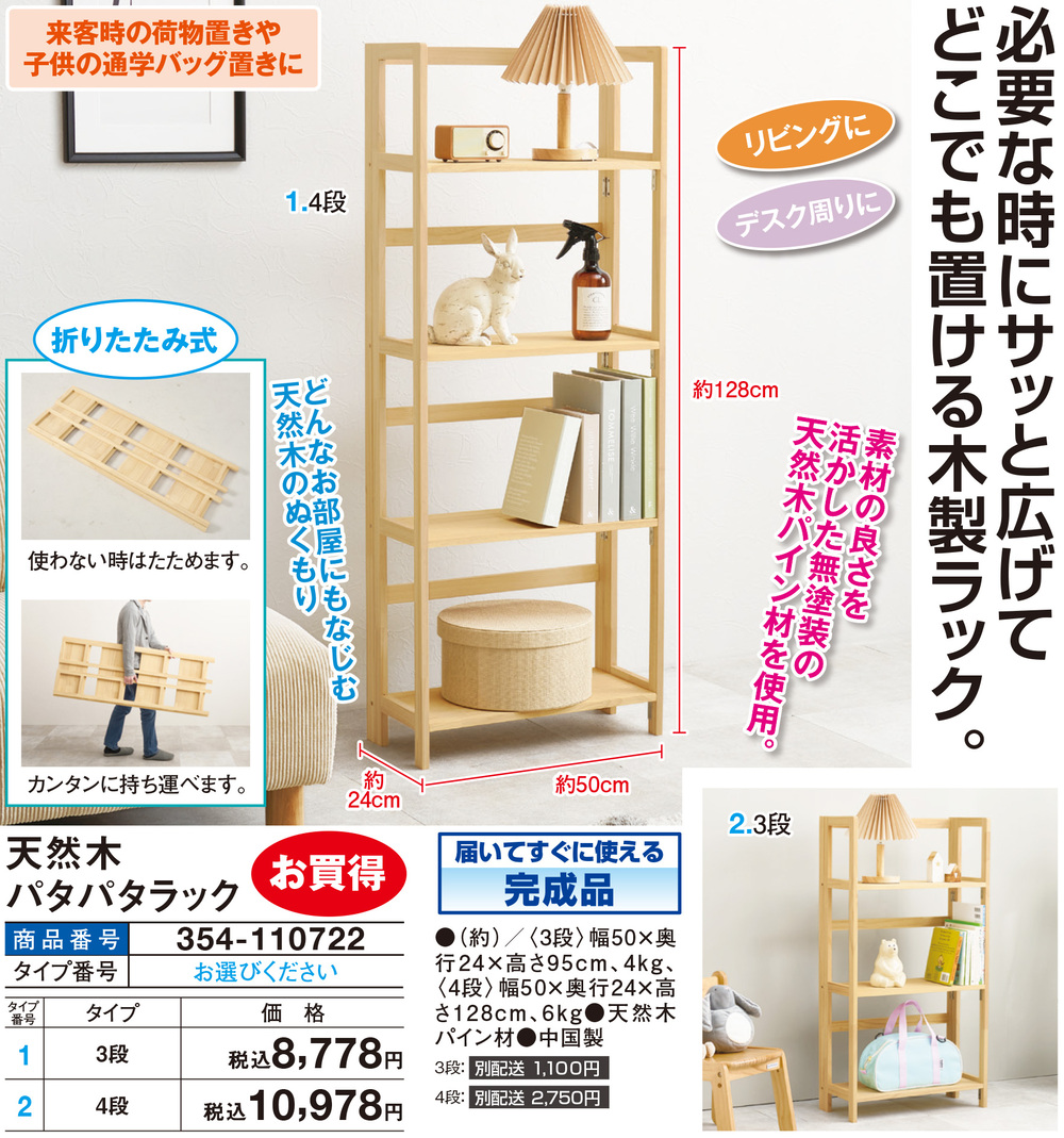 ●(約)/<3段>幅50×奥行24×高さ95cm、4kg、<4段>幅50×奥行24×高さ128cm、6kg ●天然木パイン材 ●中国製
