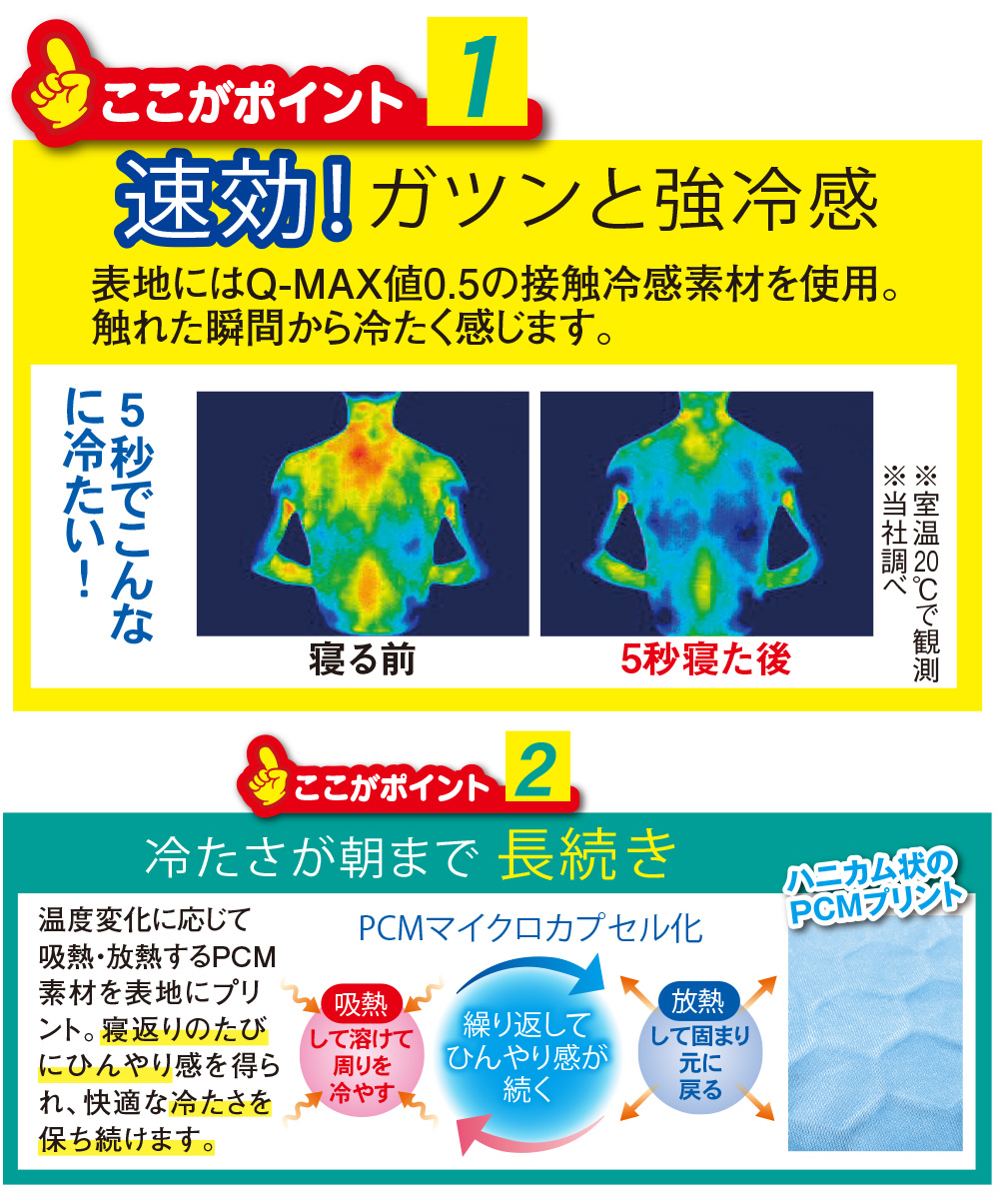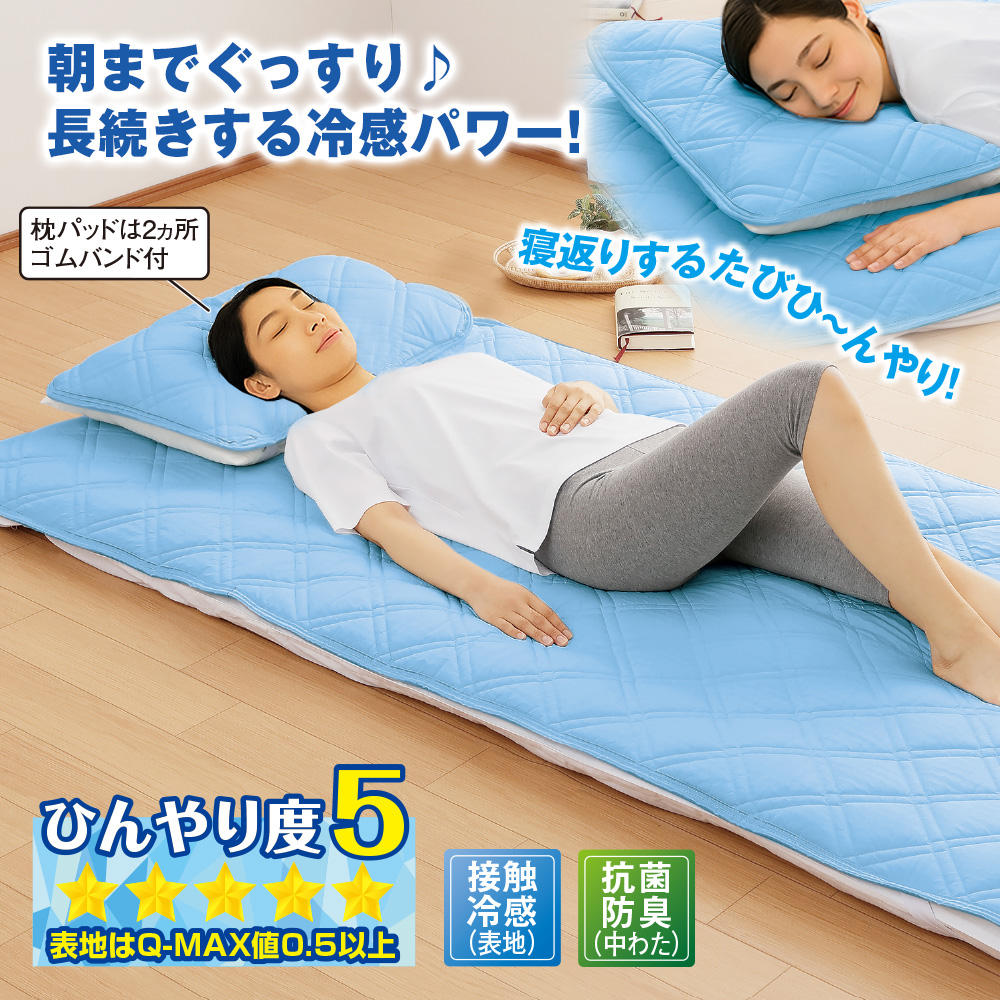 ・寝返りするたびひ~んやり! ・表地にはQ-MAX値0.5の接触冷感素材を使用 ・触れた瞬間から冷たく感じます ・温度変化に応じて吸熱・放熱するPCM素材を表地にプリント ・寝返りのたびにひんやり感を得られ、快適な冷たさを保ち続けます ・枕パッドは2ヵ所ゴムバンド付 【セット内容】 シングル:敷パッド1枚、枕パッド×1枚 セミダブル:敷パッド1枚、枕パッド×1枚 ダブル:敷パッド1枚、枕パッド×2枚