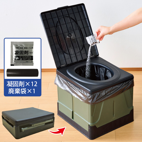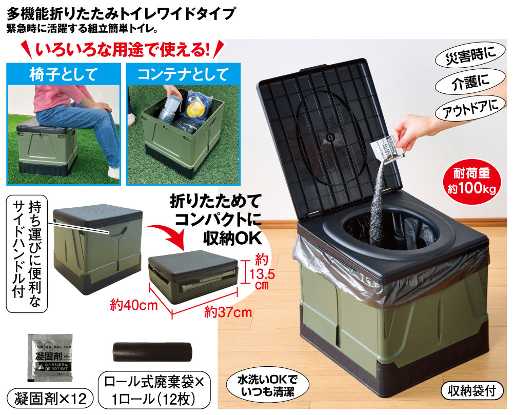 緊急時に活躍する組立て簡単トイレ! \いろいろな用途で使える!/ 椅子として コンテナとして 災害時に/キャンプに/介護に/断水時に 折りたためてコンパクトに収納OK 持ち運びに便利なサイドハンドル付 水洗いOKでいつも清潔 ●収納袋付 ●凝固剤×12 ●ロール式廃棄袋×1(1ロール12枚) ●耐荷重約100kg