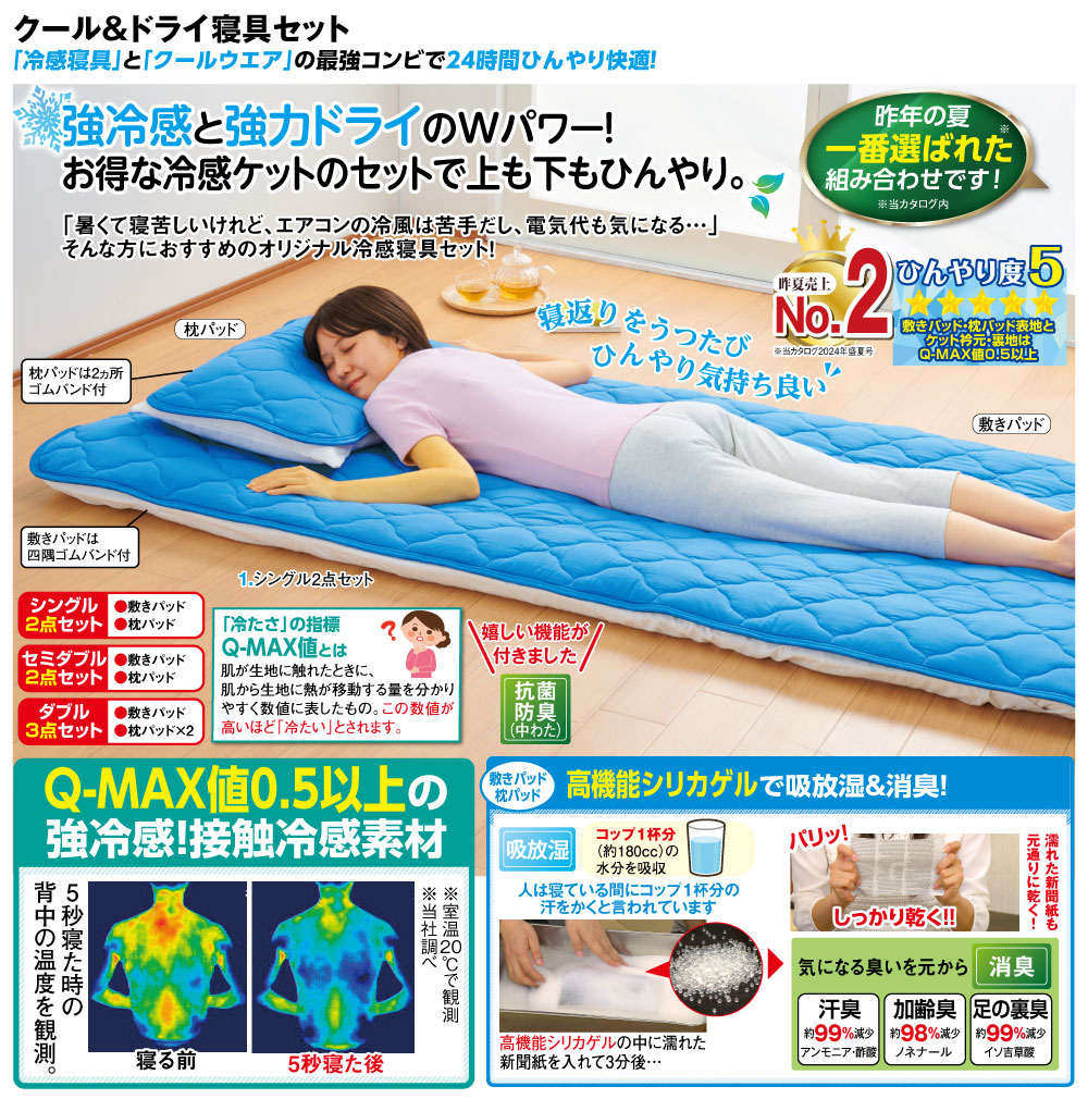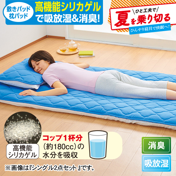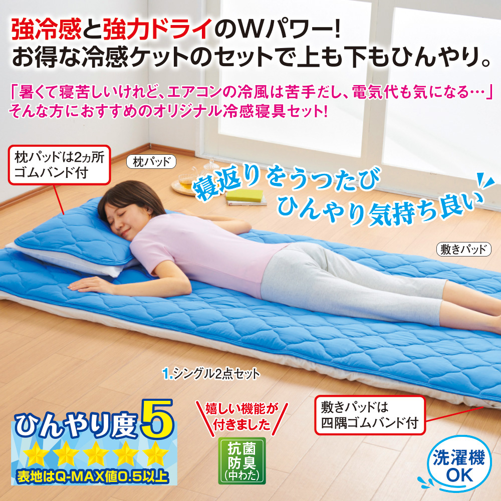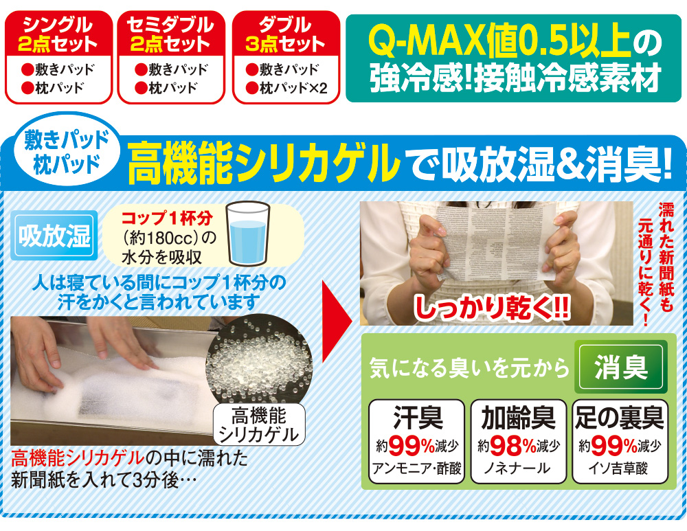お得な冷感ケットのセットで上も下もひんやり。 <接触冷感素材> Q-MAX値0.5以上の強冷感! 高機能シリカゲルで吸放湿&消臭!(※敷パッドと枕パッド) 【セット内容】 <シングル2点セット> 敷きパッド(シングル)×1枚+枕パッド×1枚 <セミダブル2点セット> 敷きパッド(セミダブル)×1枚+枕パッド×1枚 <ダブル3点セット> 敷きパッド(ダブル)×1枚+枕パッド×2枚 <シングル2点セット+ケット> 敷きパッド(シングル)×1枚+枕パッド×1枚+ケット(シングル)×1枚 <セミダブル2点セット+ケット> 敷きパッド(セミダブル)×1枚+枕パッド×1枚+ケット(シングル)×1枚 <ダブル3点セット+ケット> 敷きパッド(ダブル)×1枚+枕パッド×2枚+ケット(シングル)×1枚