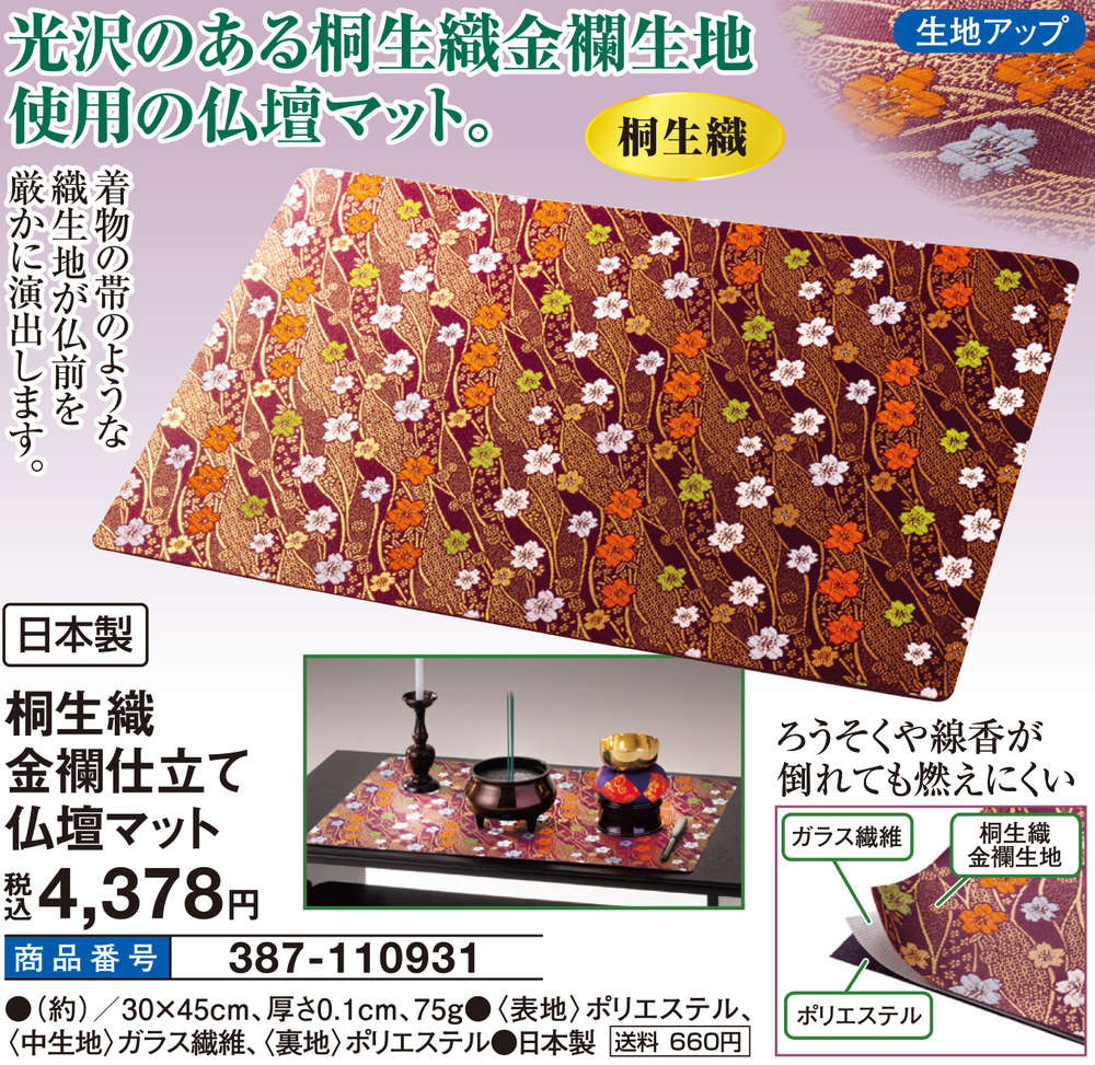 ●着物の帯のような織生地が仏前を厳かに演出します。 ●ろうそくや線香が倒れても燃えにくい