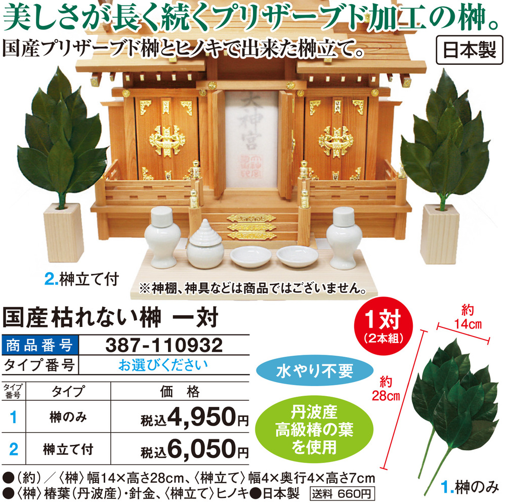 ●国産プリザーブド榊とヒノキで出来た榊立て。 ●水やり不要 ●丹波産高級椿の葉を使用