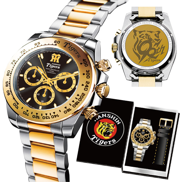10万年に1秒の誤差しか許さず太陽光をパワーにする機能性!電波ソーラークロノ! 阪神タイガース創設90周年記念モデル!! 【牛革ベルト】 チェンジベルトには高級素材の牛革ベルトを採用! TPOに合わせてベルトの取り換えも簡単にできます。 【裏蓋】 裏面にはシリアルナンバーとロゴマーク 【箱】 ロゴを金箔押しで刻印 ・時刻合わせ・電池交換不要 ・チェンジベルト付 ●阪神タイガース承認 ●限定2025本 ●10気圧防水 ●ベルト:三つ折プッシュタイプ