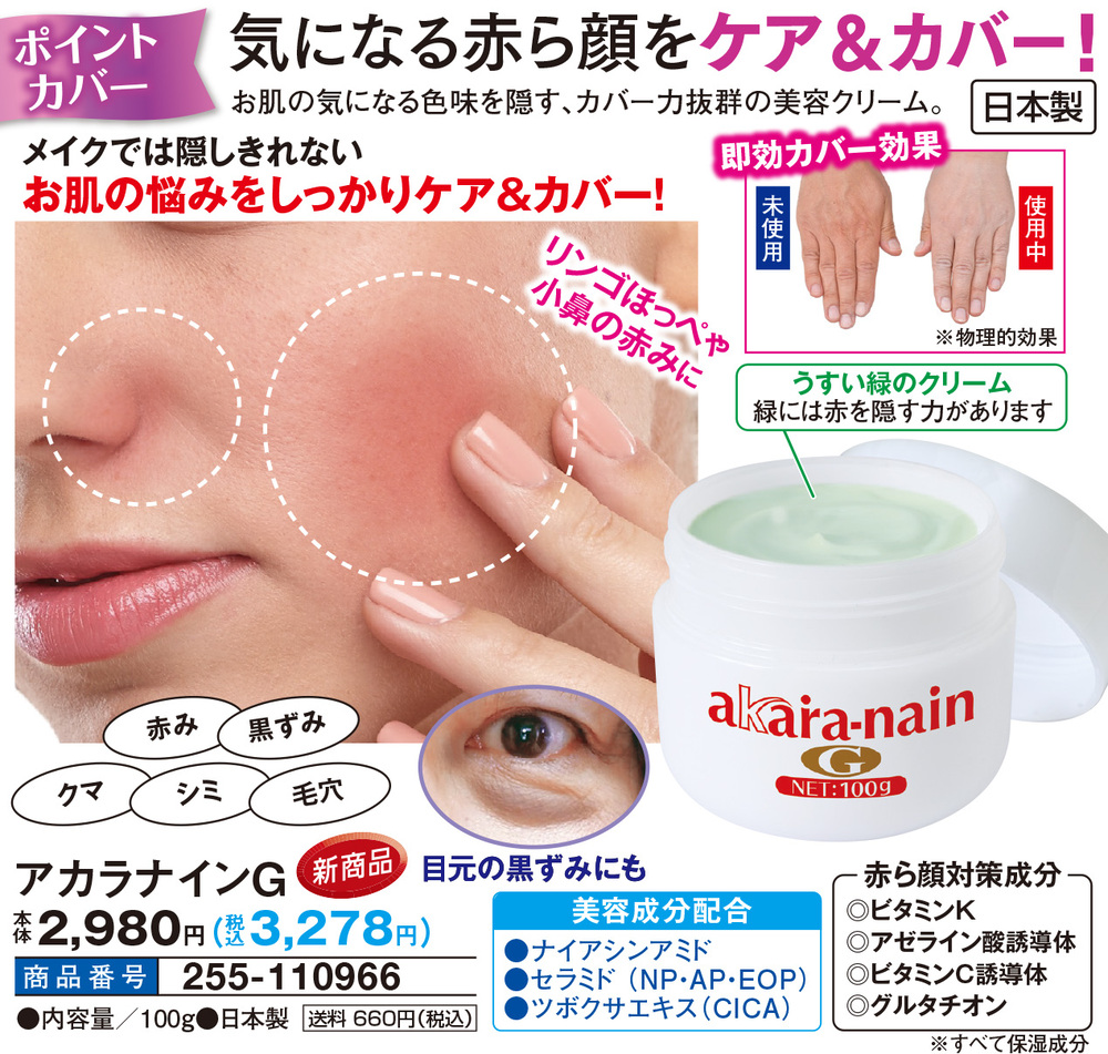 気になる赤ら顔をケア&カバー! お肌の気になる色味を隠す、カバー力抜群の美容クリーム。 \即効カバー効果/ メイクでは隠しきれないお肌の悩みをしっかりケア&カバー! ※物理的効果 【うすい緑のクリーム】 緑には赤を隠す力があります。 【リンゴほっぺや小鼻の赤みに】 ●赤み ●黒ずみ ●クマ ●シミ ●毛穴 ●目元の黒ずみにも 【美容成分配合】 ●ナイアシンアミド ●セラミド(NP・AP・EOP) ●ツボクサエキス(CICA) 【赤ら顔対策成分】 ●ビタミンK ●アゼライン酸誘導体 ●ビタミンC誘導体 ●グルタチオン ※すべて保湿成分